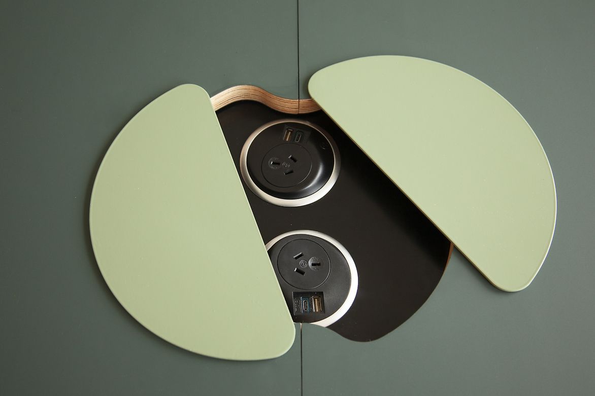 The metal leaves at the table’s core are more than just a satisfying, smooth swivel (you WILL be playing with these more than is absolutely necessary). Hidden beneath is a useful recess, ideal to hide away items that might otherwise clutter the wide expanse of table surface – or can even contain a handy power port to keep your devices running as you work.