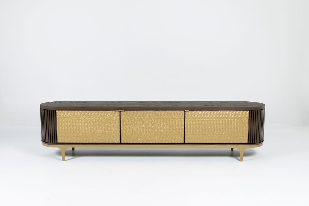 Inspired by how triptych art told a story, the credenza was designed as a three-door cabinet to display the woven panels as an art form. The credenza form took design cues from the Art Deco period when furniture was known for the inherent design qualities of relative simplicity, symmetry and unvaried repetition of elements and use of colour. The softness and round ends of the cabinet embrace the woven door panels like a korowai (cloak). The colour of the woven panels and metal details being painted gold, bring a luxurious feeling to the overall design.