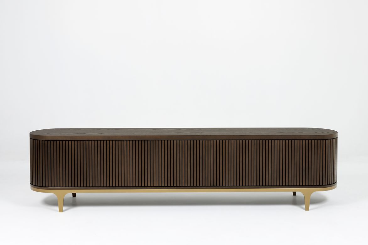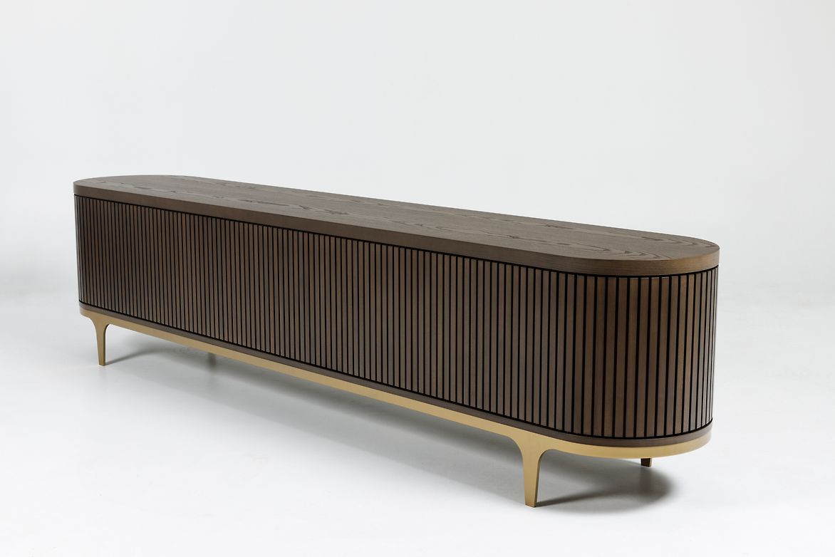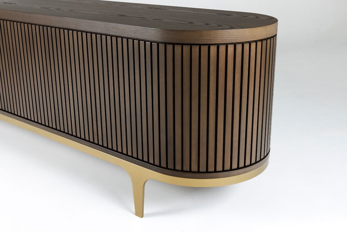 The subtle but deliberate craftsmanship features include negative detailing, curved ends and timber slats that carry on around the entire cabinet including the back. These handcrafted details highlight the precision required to bring the design to reality.