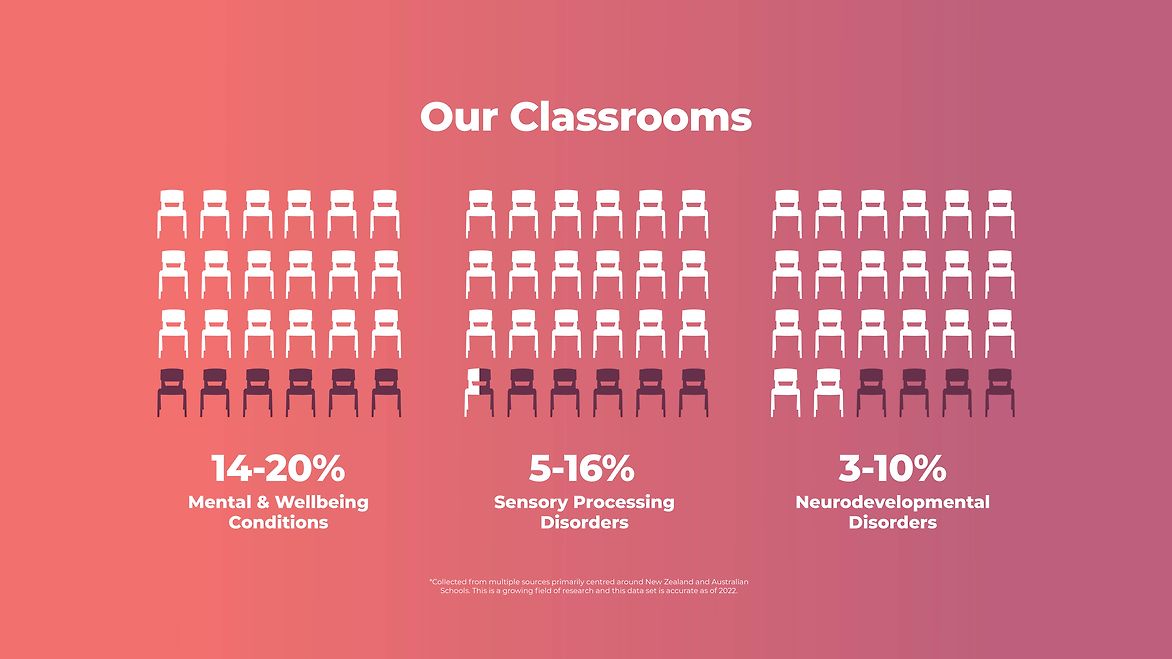 Research showed at least 1/3 of the kids in schools across New Zealand and Australia suffer from mental health and wellbeing challenges ranging from anxiety and depression, sensory and processing conditions to a broad spectrum of neurodivergent needs that only continue to rise. Anecdotally the numbers in classrooms are believed to be even higher.