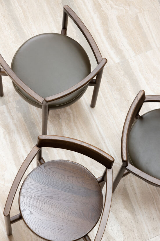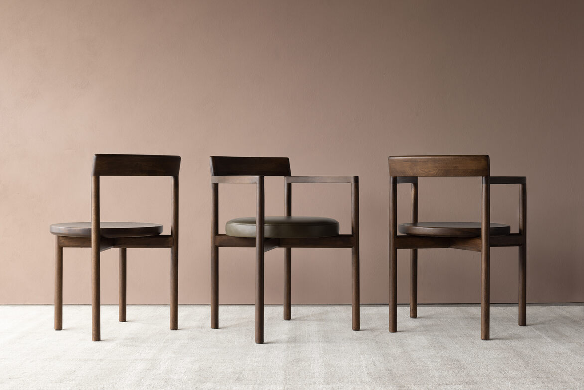 The Armchair is designed around a soft circular seat, enclosed by lightly curved arms into the backrest. This geometric typology creates a simple silhouette with the necessary softness introduced with a subtle back angle and radii on front or forward facing edges. The side chair uses the same language in legs with a new geometry introduced on the seat. The first prototype of the side chair used the same round seat as the armchair. We found this round seat without the arms looked out of place proportionally. This was refined to a new form comprised of a square and half rounded back edge.