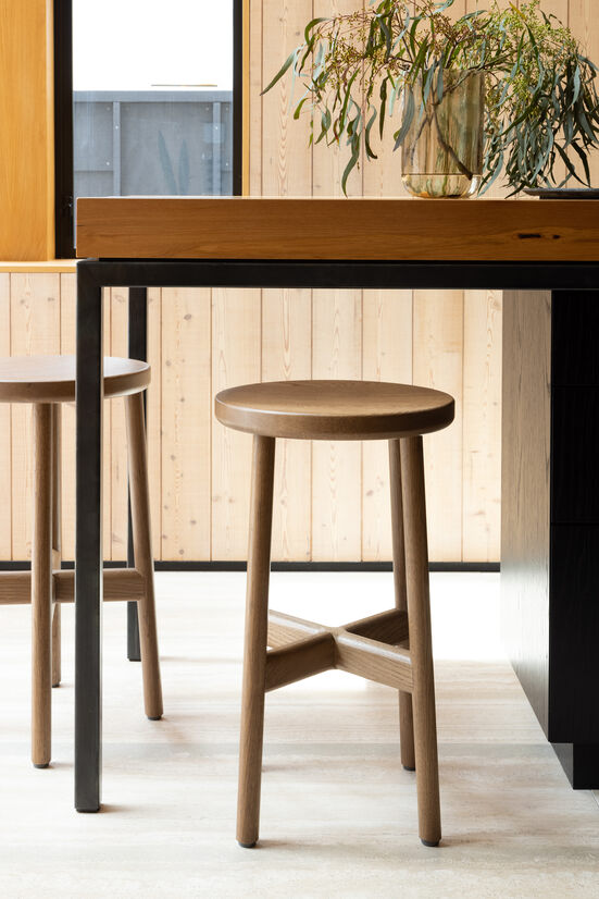 The linear language of the chairs was adapted lightly for the barstool, where we needed to introduce a slight angle on the legs, due to the extra height and required balance of a barstool, but retained the softened details in the footrest.