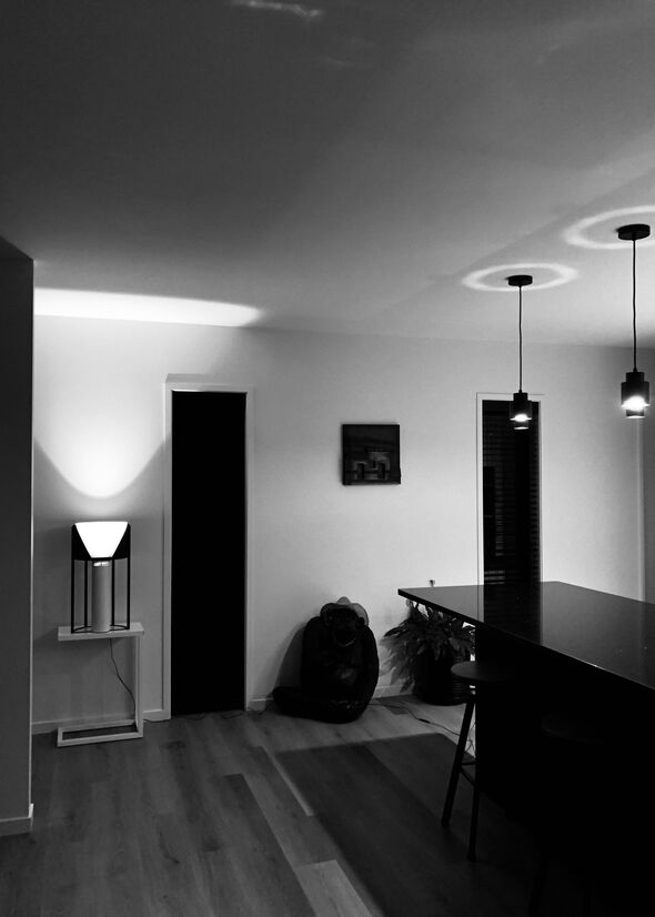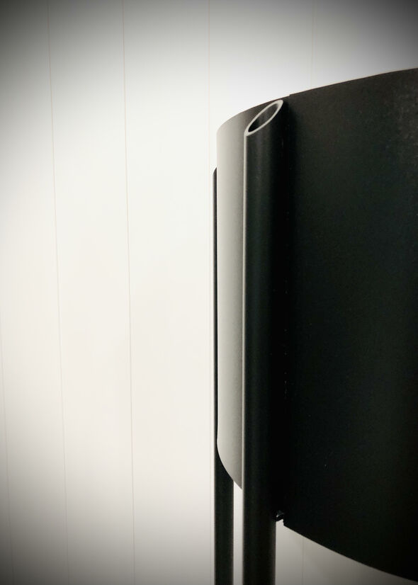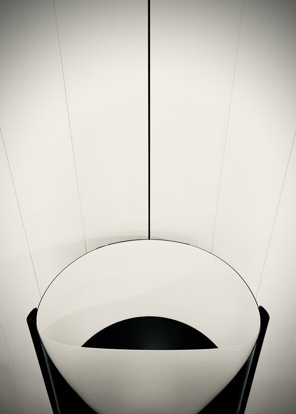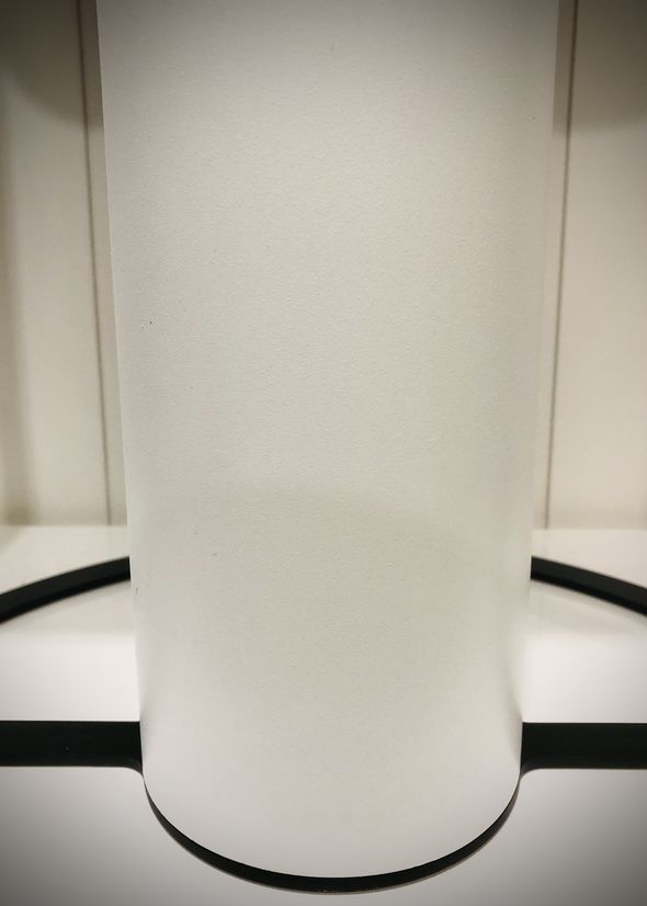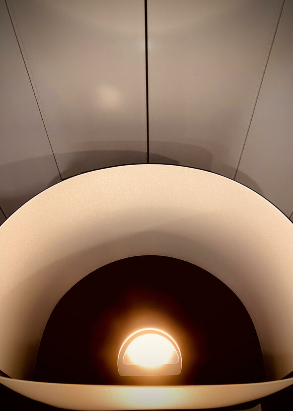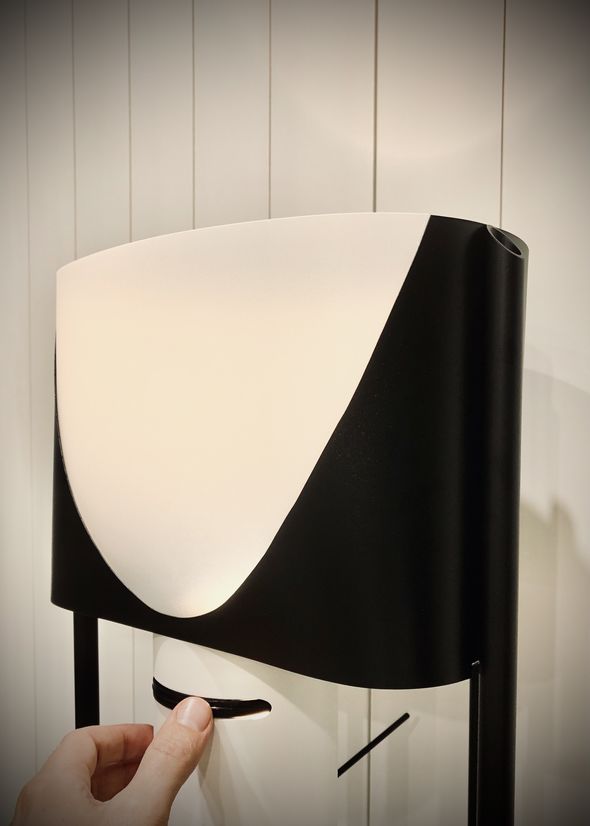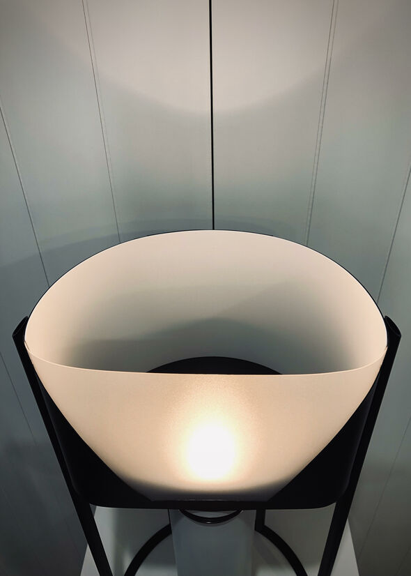 The outer tube mitre detail blends the strong frame transition up to the thin shade. The translucent areas of the shade balance the white and black parts; both of which are also present on the frame. As well as being space saving, the D-shaped shade allows the translucent part to shine brightest, being closest to the bulb. At certain perspectives, the shade appears as an illuminated cone, supported by a black surround.