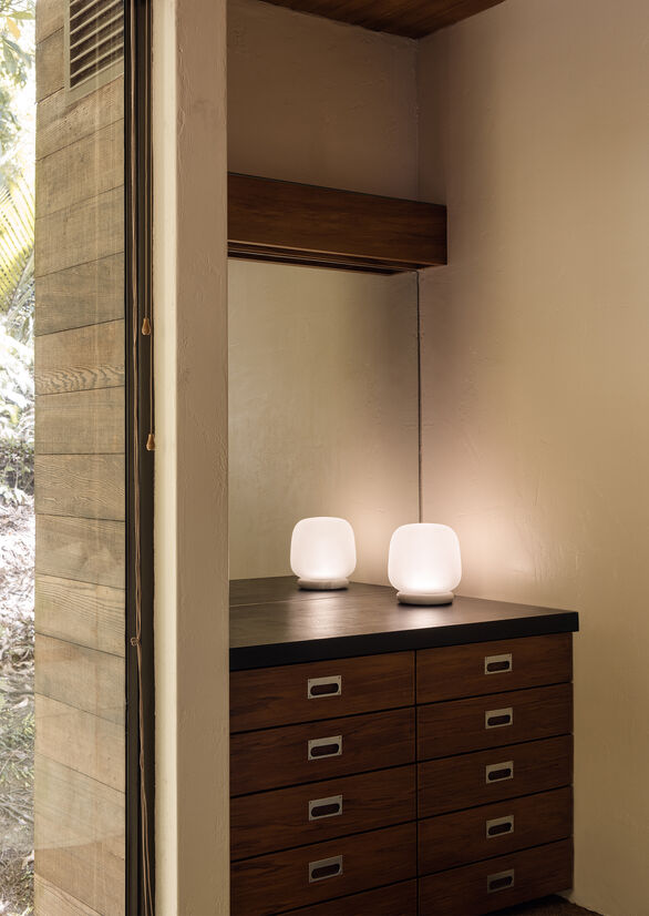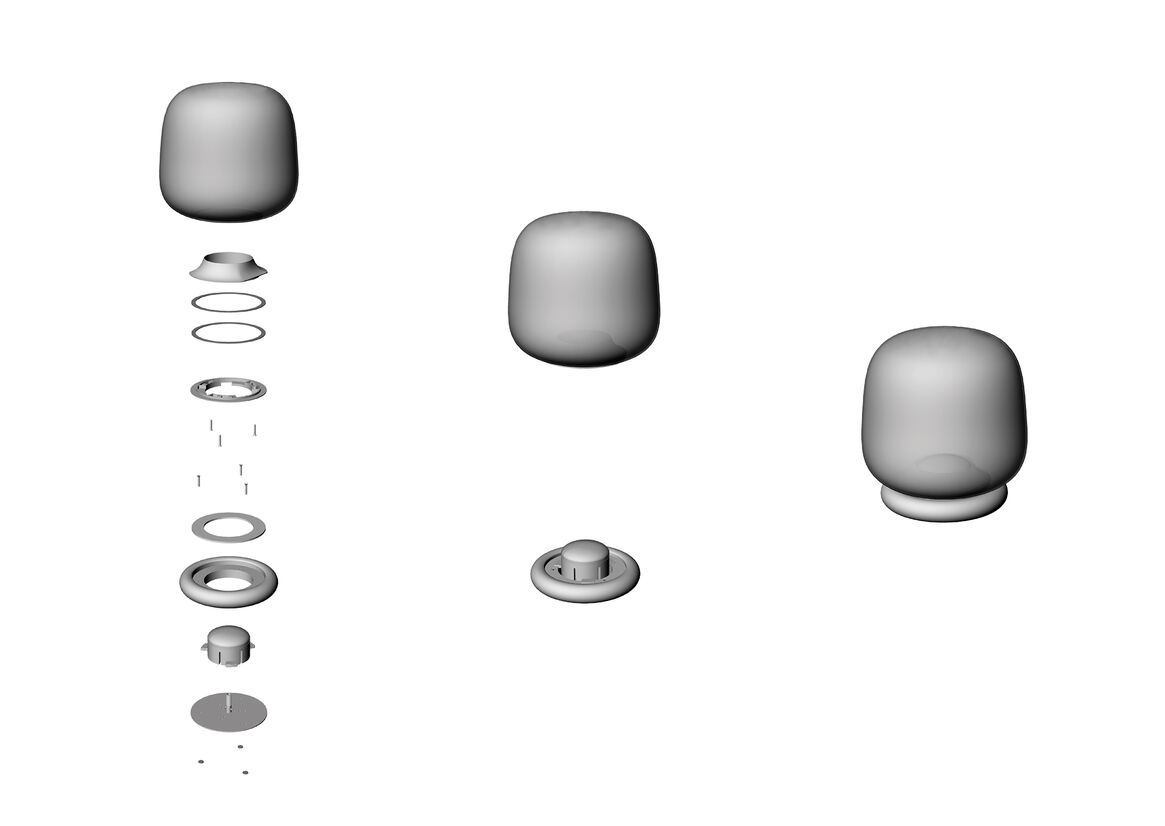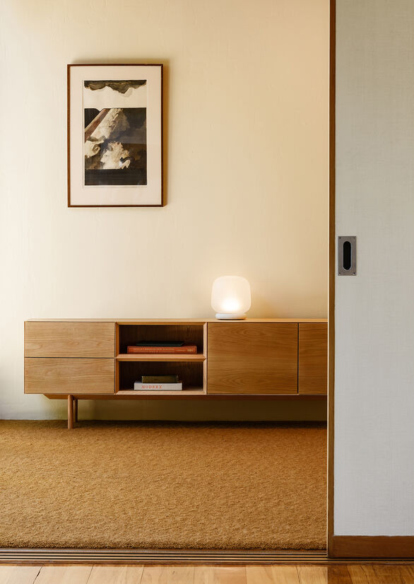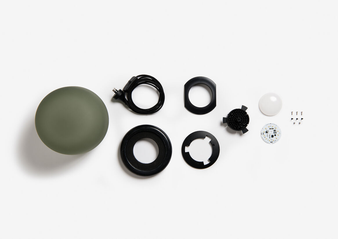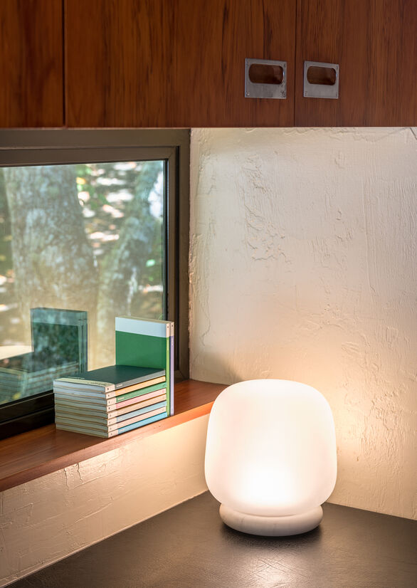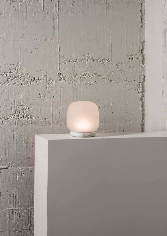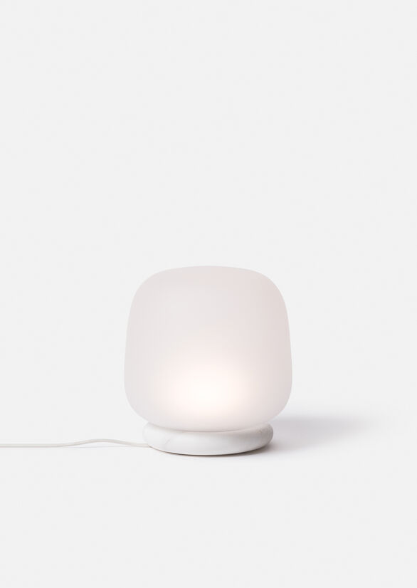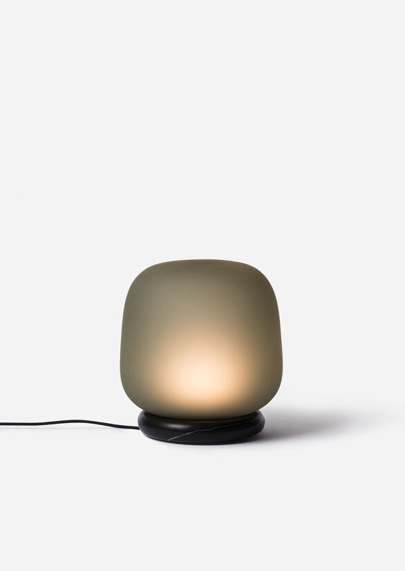 We wanted to pair the frosted glass shade with a solid and sturdy material, so the lamp felt well-grounded. For this reason, we considered a range of stones and grains to best complement the glass. The stone also reinforces the use of high-quality materials throughout the lamp.