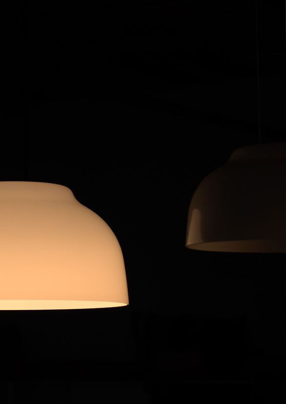 Producing a pendant compatible with standard light fittings from a single piece of blown glass required multiple iterations and close to two years of development. The final design is available in two sizes—small (E14) and large (E27)—with a shared construction.