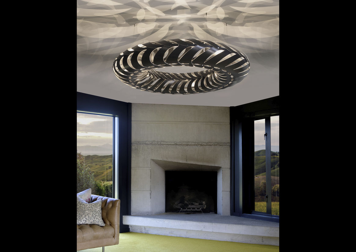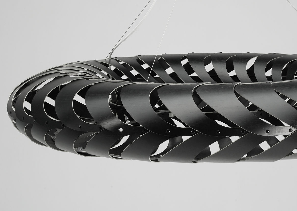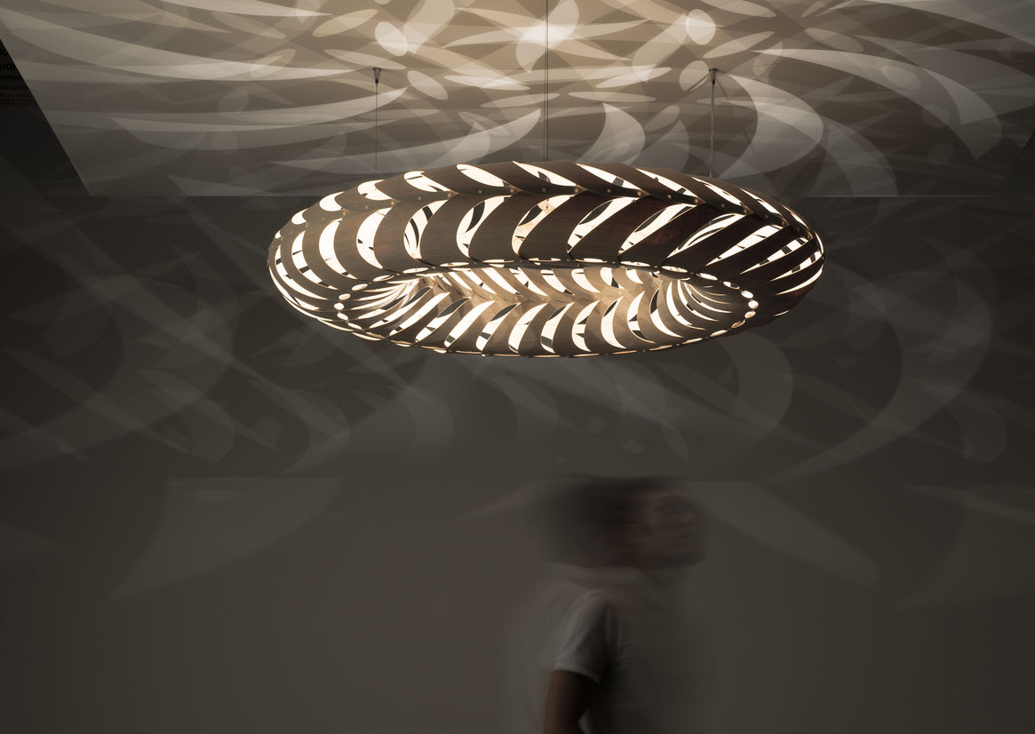 The Maru light’s torus form, with a pattern of vesical piscis-like shapes cut into its surface, shines a wonderfully kaleidoscopic pattern of light and foreshadows another impressively innovative pendant from the Knight of Light.