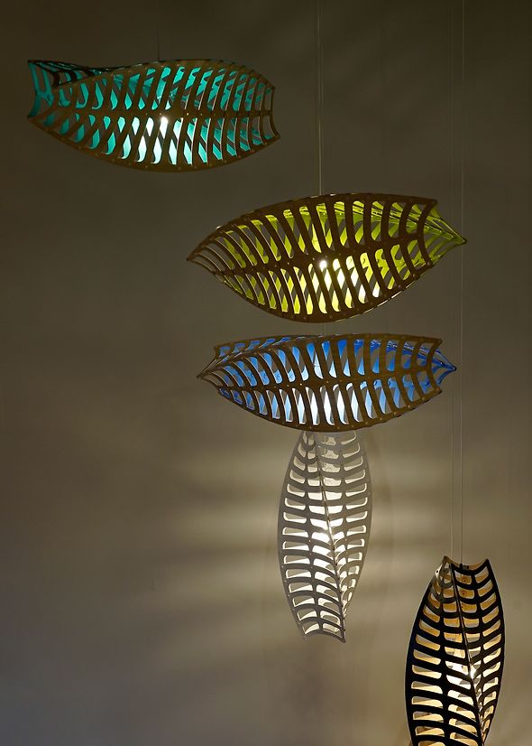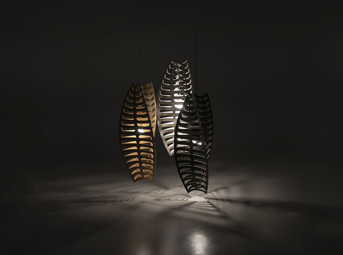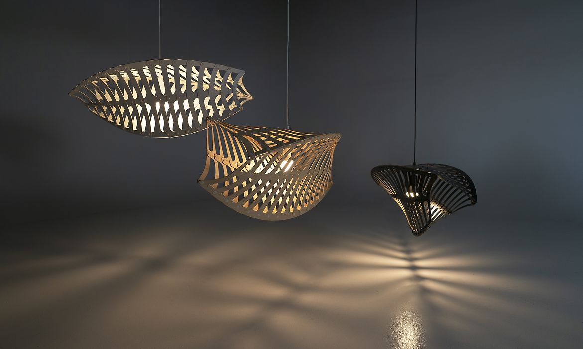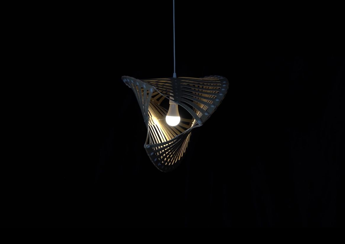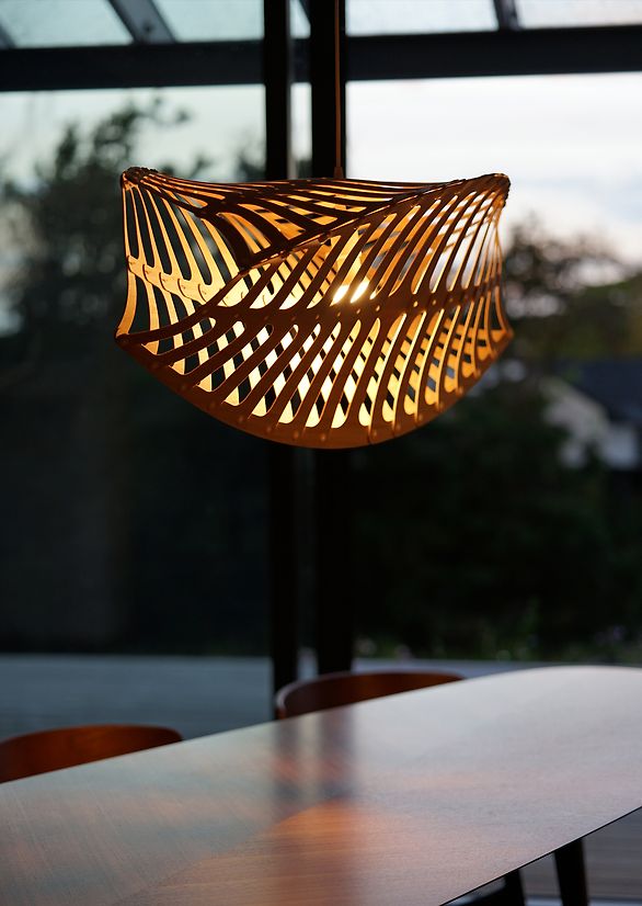 Toru is made out of 1.6mm thin pieces of CNC-cut bamboo plywood, clipped together with simple nylon ratchet clips. The bamboo material is sourced from an FSC accredited factory and is a by-product of the bamboo food industry. The light can be transformed through a selection of painted finishes on one or sometimes both surfaces (12 colour options available).