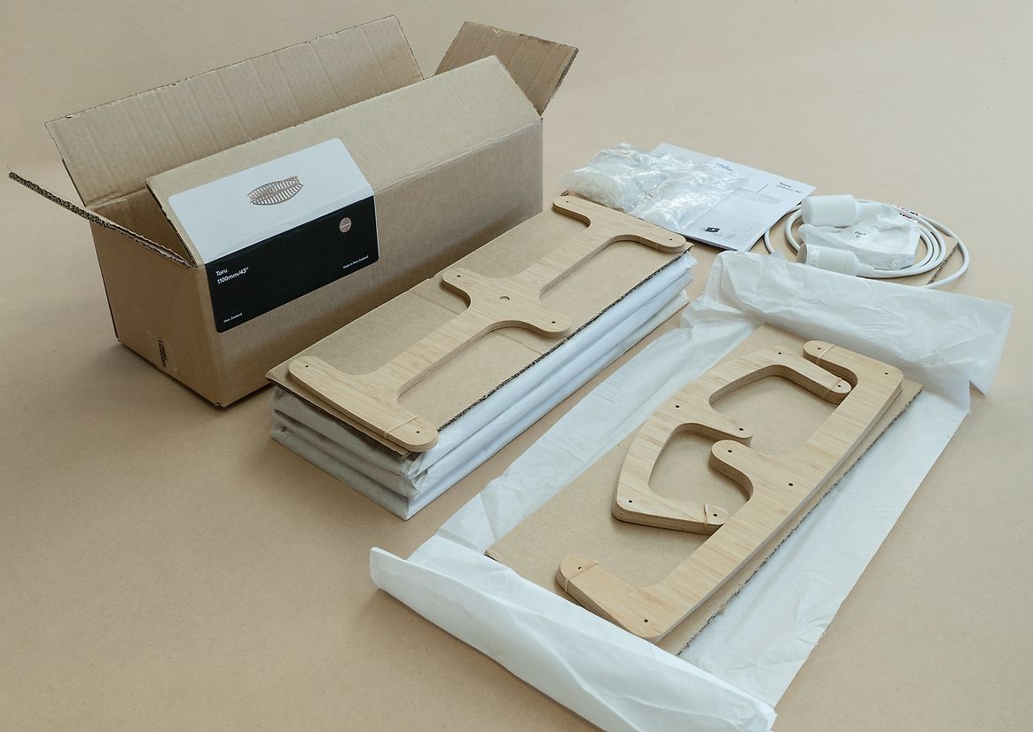 Toru is a kitset product, entirely flat-pack and is shipped in a box similar in size to a shoebox. The light is assembled at home over approximately one hour via an instructional video and printed instruction booklet.