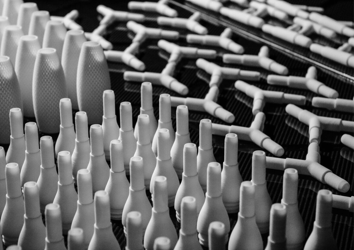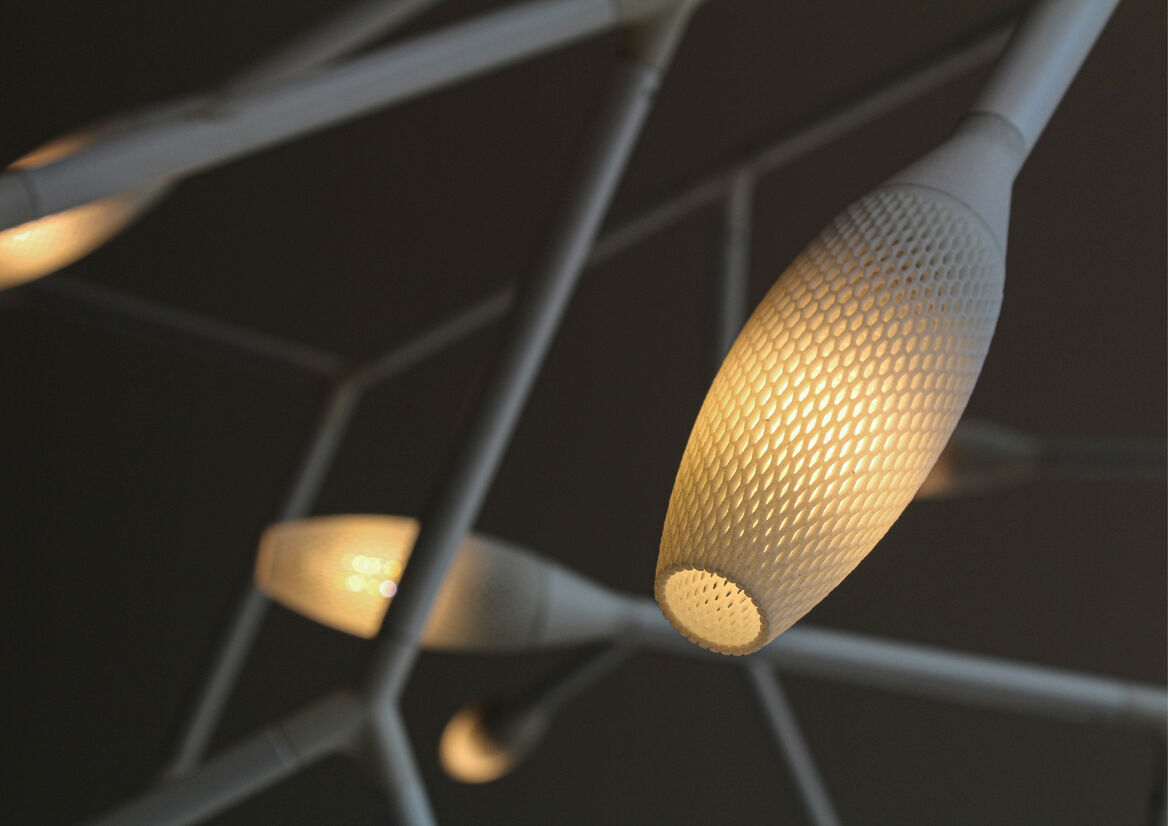 The catalyst for the lighting system emerged from an entirely pragmatic opportunity — to utilize the dead space between parts built within industrial selective laser sintering (SLS) 3D printer machines. Filling these gaps with smaller maneuverable parts minimizes unnecessary material loss and increases machine production yield. Lighting was an industry identified as a platform where the unique capabilities of additive manufacturing could be applied in novel ways, in particular with the interplay of lighting effects with otherwise unachievable geometries.