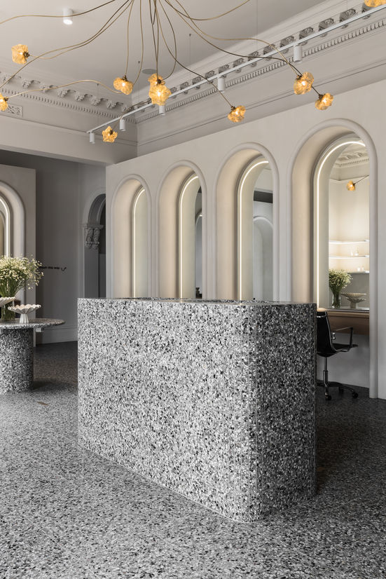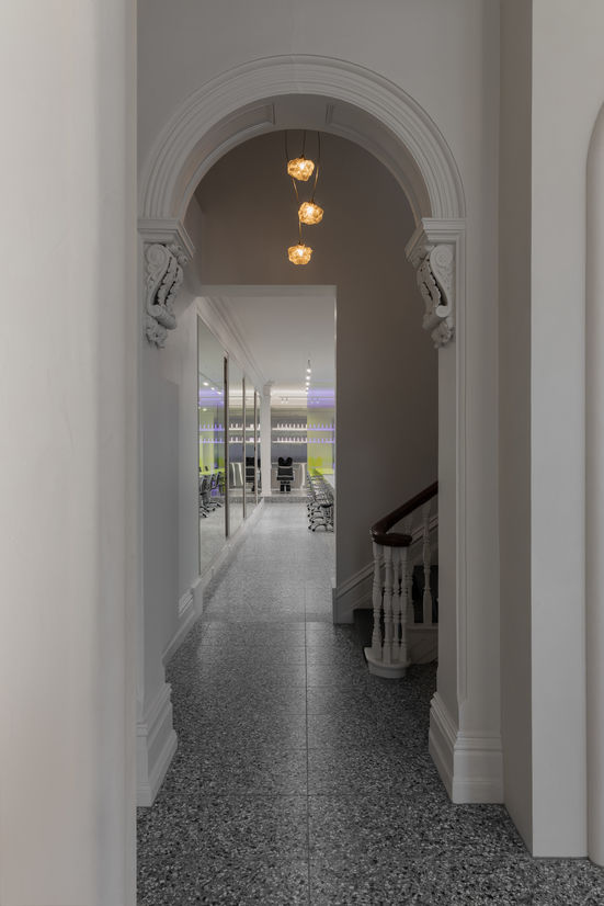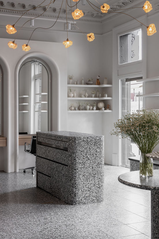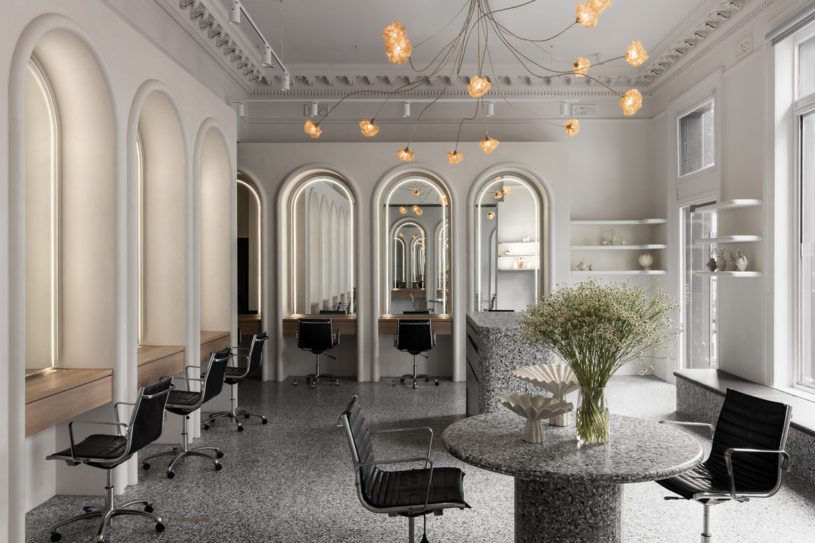 The Globus Collection was born from the opportunity to design and execute a lighting collection that straddled the line between an organically artistic element and a structurally functional pendant. The piece was designed to complement the newly renovated Joey Scandizzo flagship salon. The high ceilings and curved arches of the newly renovated 1890s Victorian Italianate building were kept in mind as we began to sketch ethereal objects with a delicate appearance of floating in space.