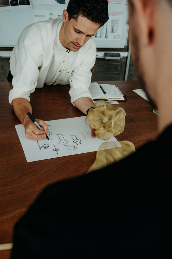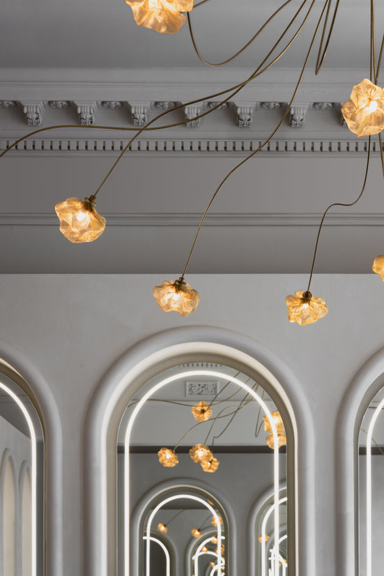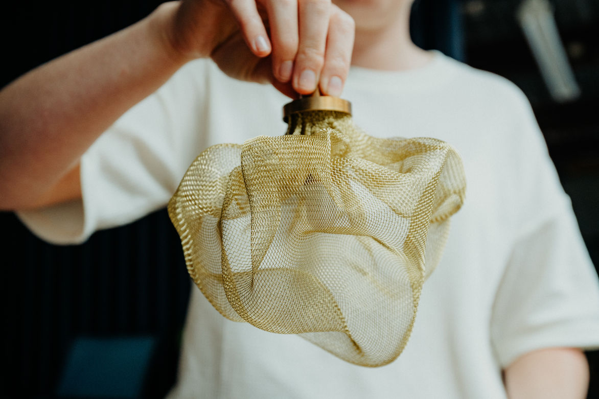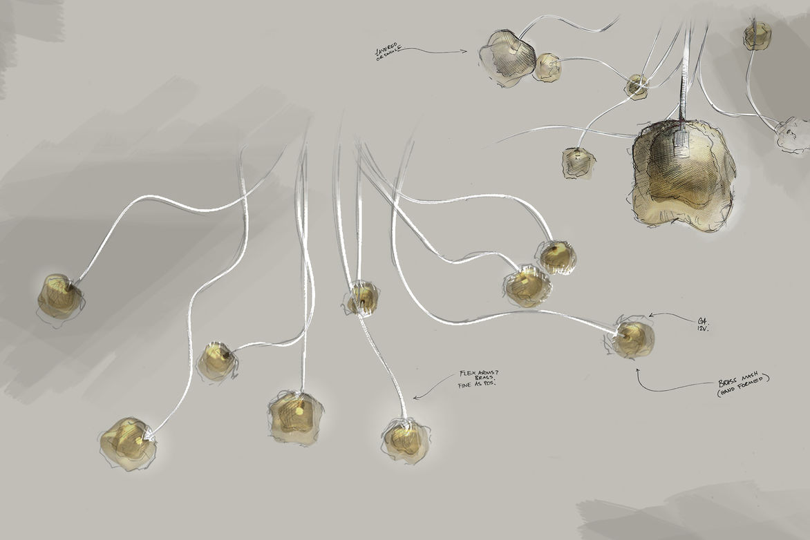 From beginning to end, the creative development of the piece called for a certain level of trust in the design process. By handcrafting each object, the pieces take shape organically — resulting in a family of unique forms. The sophisticated materials and finishes combine to produce a gentle light defused by layers of mesh, adding energy to the space without dominating or appearing too ornate.