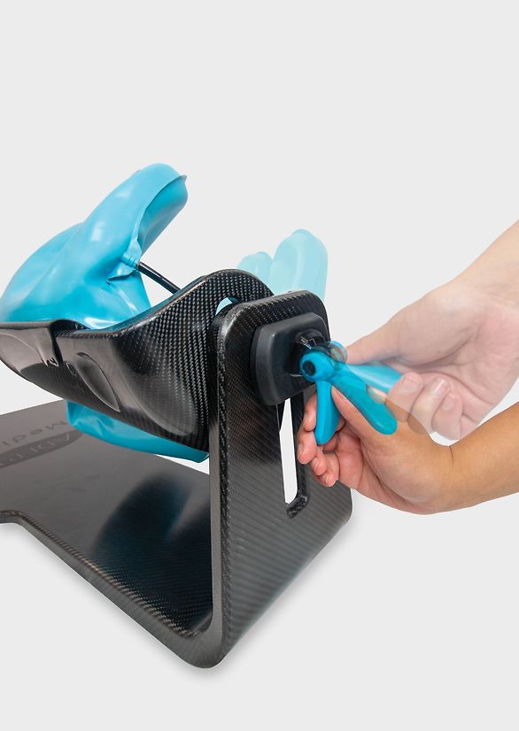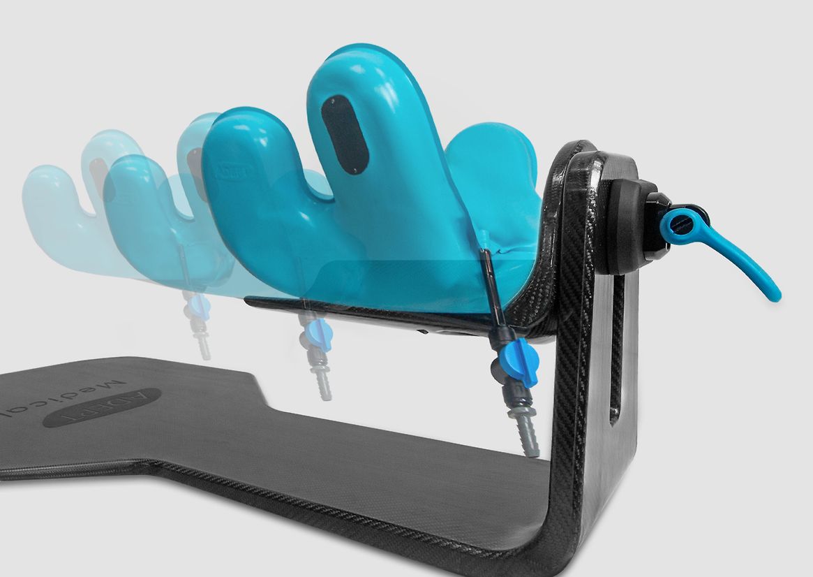 Feedback suggested need for an improved patient support to immobilise the head during image guided therapies, especially strokes. There were a selection of products available for this purpose but none were widely accepted for Interventional Neuroradiology, some consisting of basic foam form, others with metallic components inducing radio shadow. Placing a patient under anesthesia adds another layer of cost / risk to these procedures and if there were a better solution to immobilise an awake patient, it would be widely adopted. The design needed to: Immobilise the patients head still for the numerous Angiographies required to diagnose and treat Strokes and other vascular malformations. A 3D model of the cerebral vascular system is acquired via CT and this is also overlaid with the 2D Angiography image to assist with navigation, making immobilisation critical. Be radiolucent allowing clear imaging of the cerebral vascular system when viewed from multiple angles. Comfortably accommodate different head shapes and sizes. Offer some positioning versatility to accommodate the multitude of angiography imaging angles the user requires to complete the procedures, but also accommodate the patient body types, including partial side paralysis and muscle contraction induced by strokes. Be quick and easy to install and remove in emergencies. Not restrict C-arm X-ray camera procedural coverage requirements. Be durable for repeat use and easy to clean. Conform to ISO13485 device design guidelines for a Class 1 device. Have a professional design and finish, easily placed amongst international design peers such as Philips healthcare. The design of the Head Immobiliser presents as a well proportioned clean and simple solution for the required application. The innovation of the vacuum hood provides an effective solution for versatile head immobilisation in the most radiolucent materials. Highlights of bright blue intuitively inform both patient and clinician of elements to interact with. The colour usage and materials form part of a suite of solutions in the field of Image guided medicine and are key components to the companies’ brand language. Production of the soft hood proved extensively challenging, with spray moulding, rotational moulding, dip moulding all being tried, before arriving at the thermoforming and welding process. The carbon fibre has rich appeal due to the depth of the visible cloth weave and is a material associated with high performance. It is used for its excellent radiolucency, strength and weight. The strength allows the cantilevered head support to remain thin and radiolucent. The weight can be kept to a minimum with the carbon skin structure surrounding the aerated foam core, ensuring ease of handling by the nursing team responsible for set up. The product addresses each of these stakeholders needs well due to the involvement they each had in the product development. Designers spent hours observing different procedures hearing the pain points first hand from Drs locally and abroad and visited Philips HQ in Holland. These became critical markers of success for the product. It was released in May 2023.