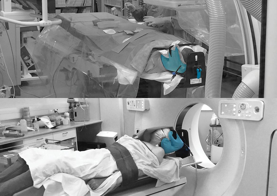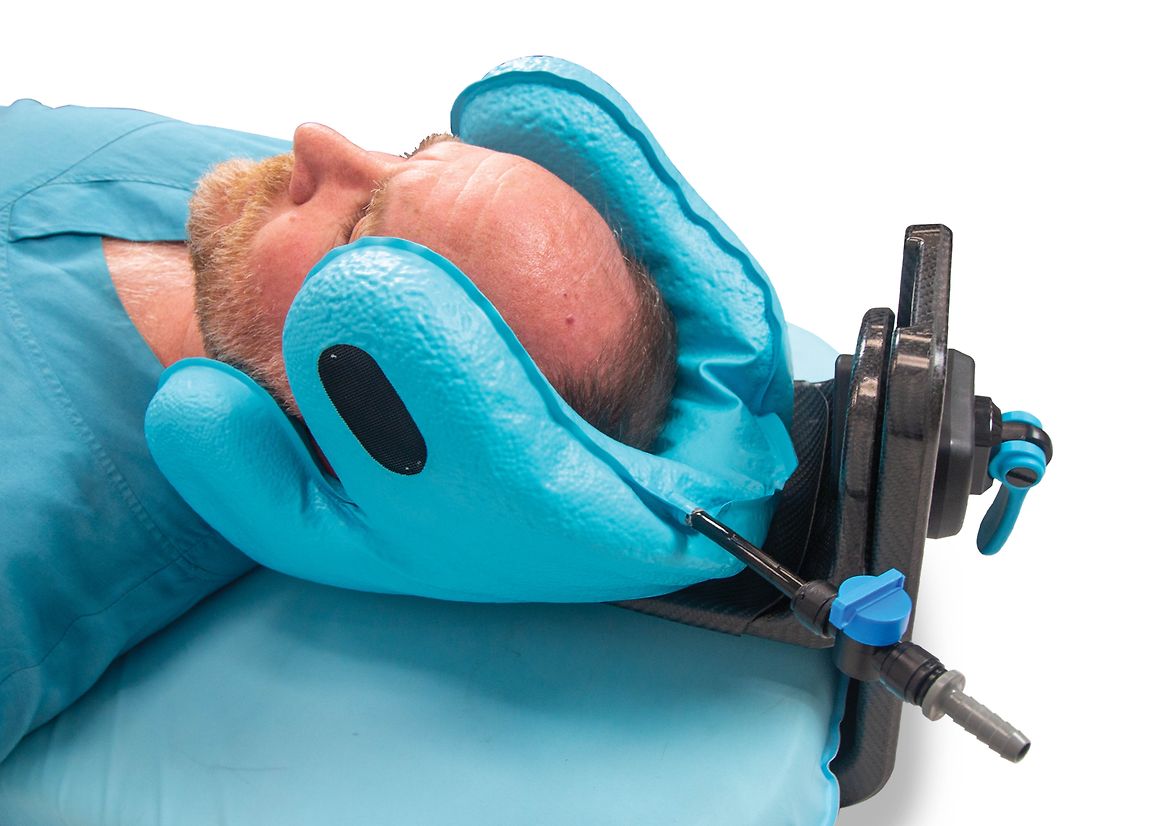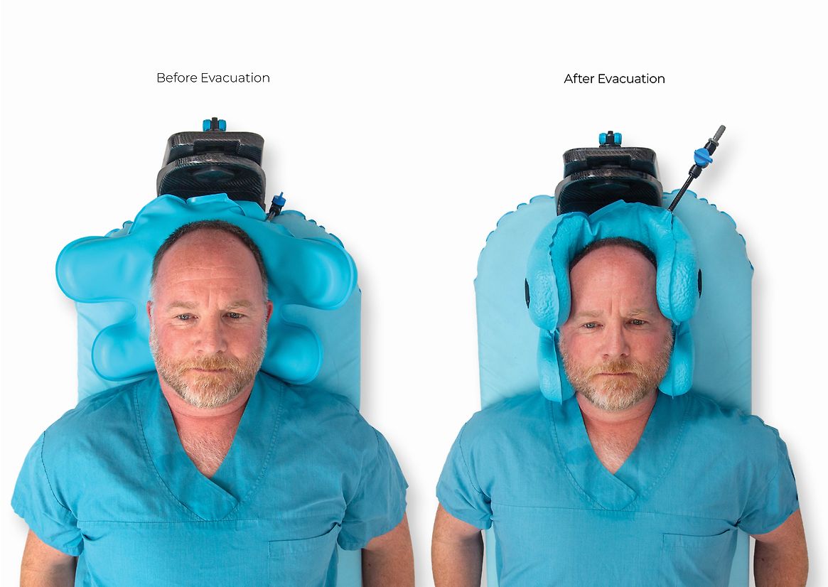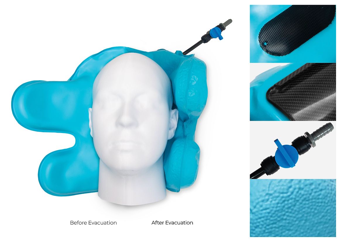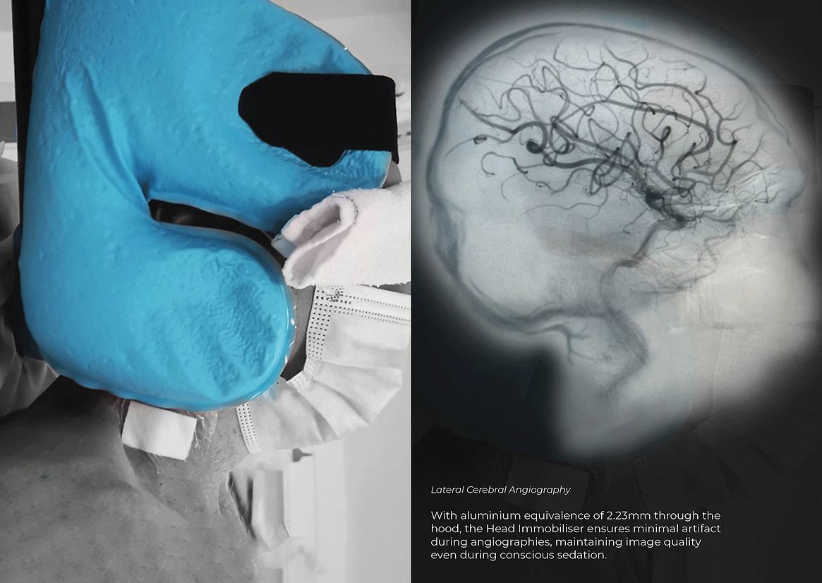 Feedback suggested need for an improved patient support to immobilise the head during image guided therapies, especially strokes. There were a selection of products available for this purpose but none were widely accepted for Interventional Neuroradiology, some consisting of basic foam form, others with metallic components inducing radio shadow. Placing a patient under anesthesia adds another layer of cost / risk to these procedures and if there were a better solution to immobilise an awake patient, it would be widely adopted.