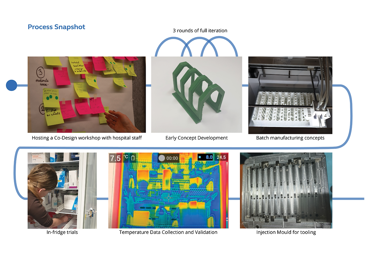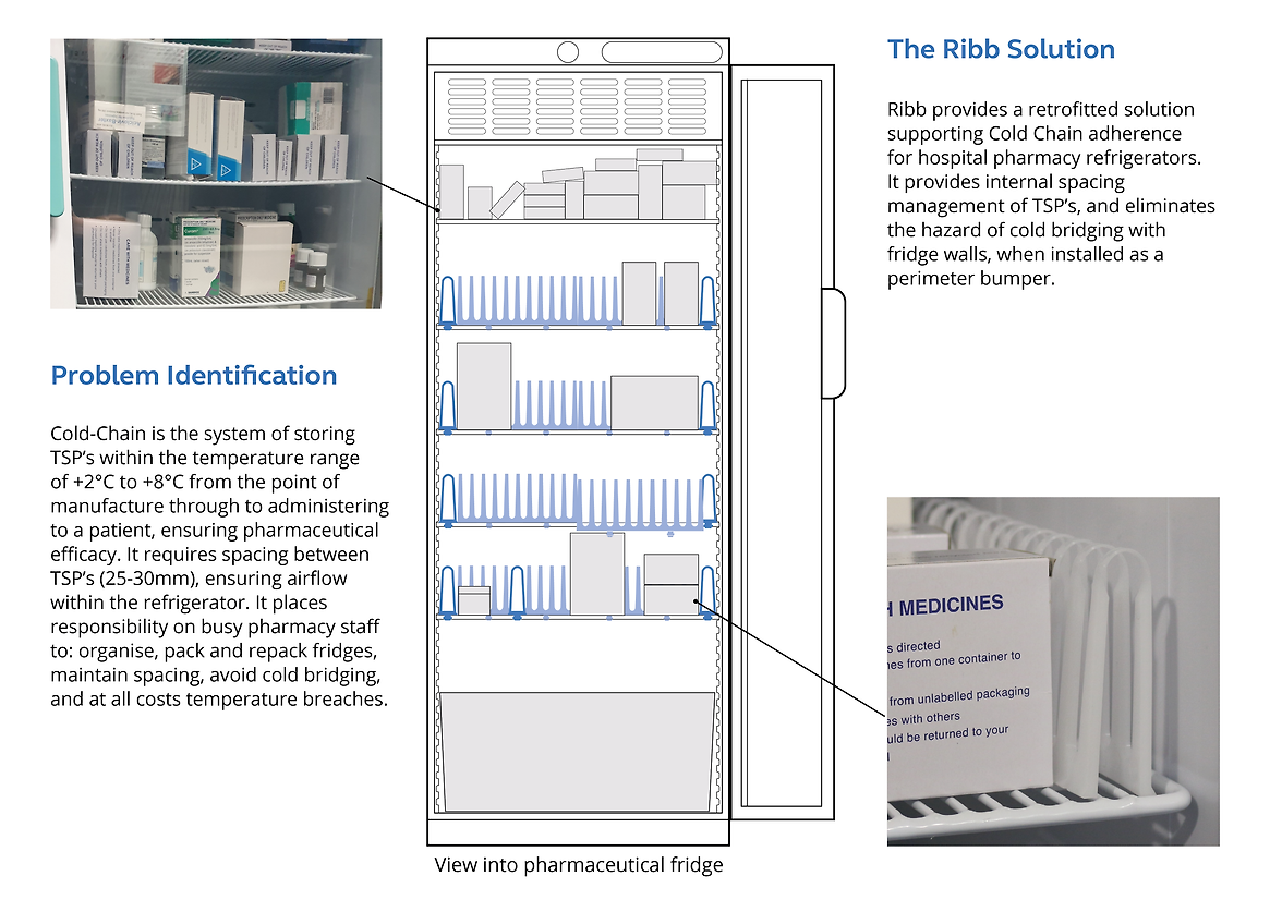 Ribb, provides a significant contribution to the management of Cold-Chain refrigerators within hospital wards, GP practice clinics and community pharmacies. Our innovative design has been trialled within a hospital environment and been demonstrably validated with regards to its design objectives: reducing cold-bridging events, maintaining spacing, improving effectiveness, usability, and navigation location of Temperature Sensitive Pharmaceuticals (TSP's), supporting air circulation, and reducing workload on pressured clinical staff.
