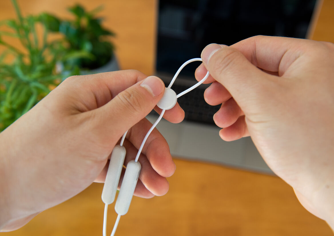 Product Highlights: • AirJust will comfortably and securely fit the majority of the demographic, by adjusting the cable length and changing the size of the silicone inserts. • The design of AirJust is symmetrical, meaning the users can wear it without worrying about differentiating left and right. • Switch on the device by squeezing the pressure-sensitive switch located on both nose pieces. The device will automatically switch off after 15 minutes. • The cable tightener attaches to the back of the case using magnets, enabling a snap and go action for fast cable management.