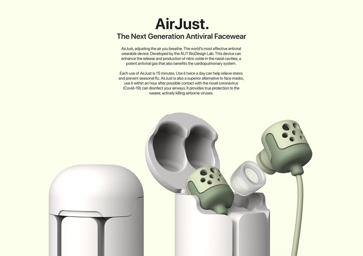 AirJust, adjusting the air you breathe. The world’s most effective antiviral wearable device. Developed by the AUT BioDesign Lab. This device can enhance the release and production of nitric oxide in the nasal cavities, a potent antiviral gas that also benefits the cardiopulmonary system.