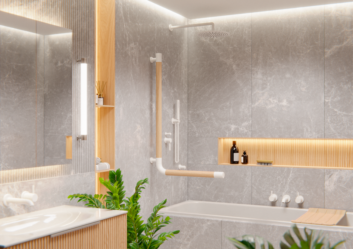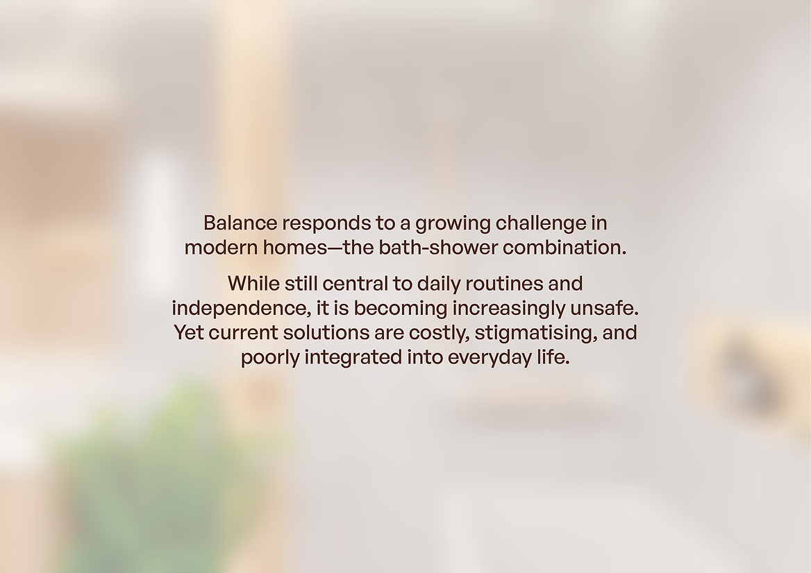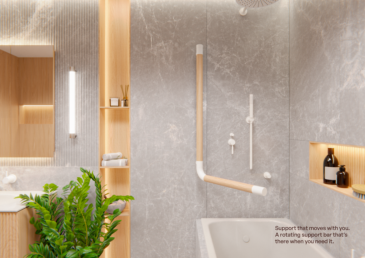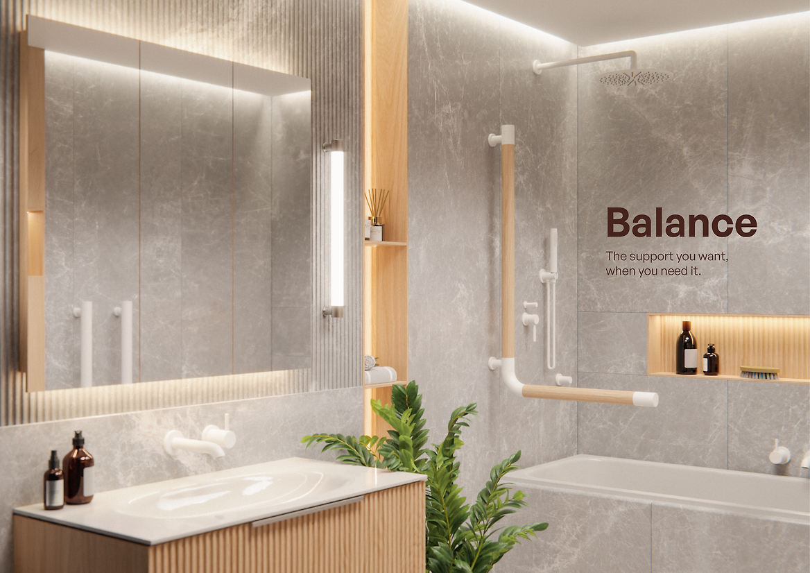 Balance is an adaptable support bar created to help individuals confidently and safely use bath-shower combinations, particularly those facing challenges from aging or reduced mobility. Traditional assistive products often feel costly, cumbersome, or medicalised, detracting from the user’s dignity. Balance offers an alternative: a product that performs a vital safety function while integrating seamlessly into the bathroom environment. Extensive user research, physical role-play and expert consultation informed the final design. The bar rotates from a discreet wall position to a fixed 90-degree support arm, providing a secure handhold during entry, exit, and bathing. The faceted timber grip provides tactile comfort, warmth, and improved usability. Balance requires no learning curve and inspires confidence through responsive mechanical feedback. This project demonstrates user-centred design, prototyping, workshop practice, and 3D rendering. It meets a common yet often unspoken need with dignity, subtlety, and care. By supporting independence in daily routines, Balance offers a quietly transformative solution in a space where thoughtful design is too often lacking.