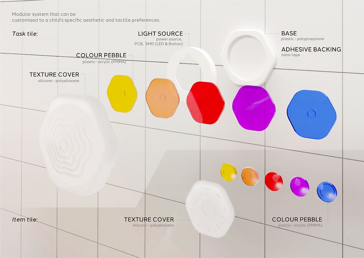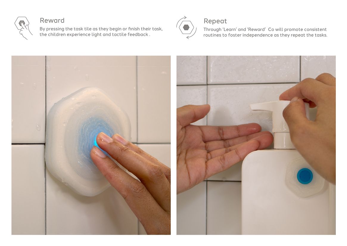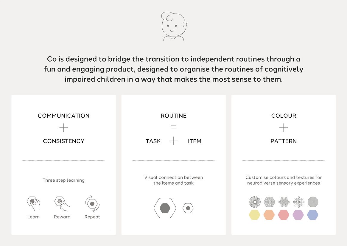 'Co' has two features; the task tile and the item tile. They form connections through different combinations of colours and patterns. The 'Co' product system draws on two key features to deliver a three-step learning, reward and repeat framework. Starting with "learn", parents and the child collaborate to build a routine based on their needs and the significance of each task and item. Through engagement with the features, children experience "reward" through visual and tactile feedback. This system promotes consistent routines to foster independence as they repeat the tasks that make up a routine.