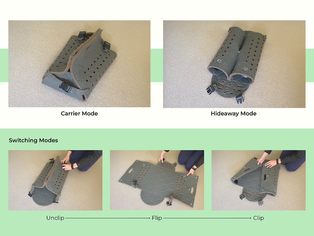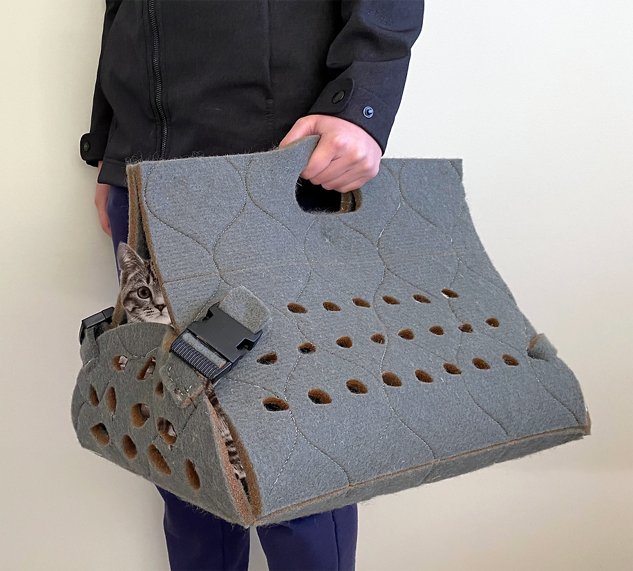 Cozygo harnesses the natural properties of wool, including sound absorption, insulation, and antibacterial qualities, to create a calming space that helps animals feel secure and at ease during travel. After reaching their destination, Cozygo Pet Carriers can be effortlessly flipped, transforming into a comfortable kennel. This design feature promotes familiarity between the pet and the product, enabling animals to engage in territorial rituals and further enhancing their comfort and acceptance of the carrier.