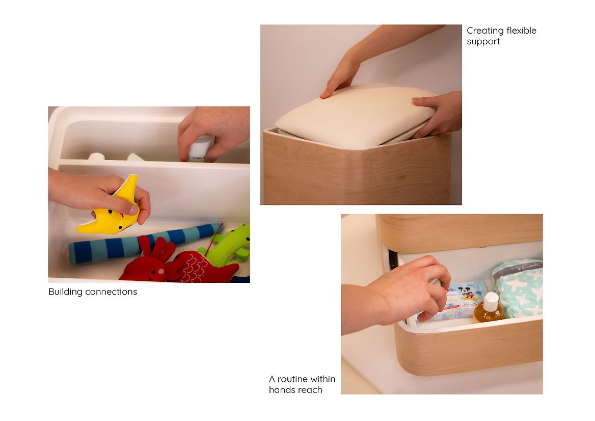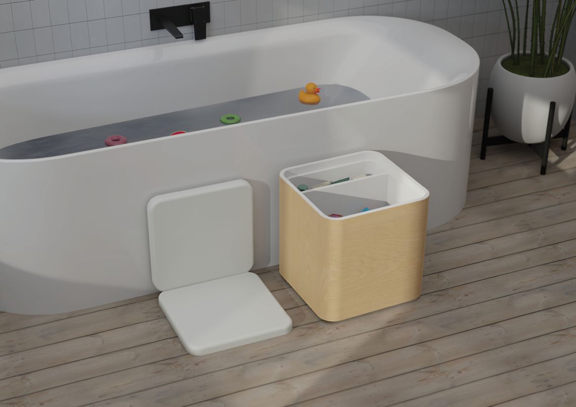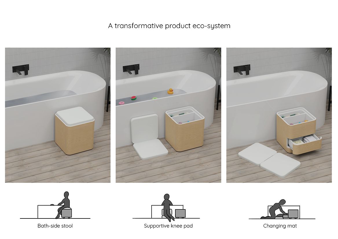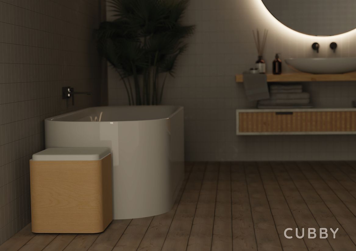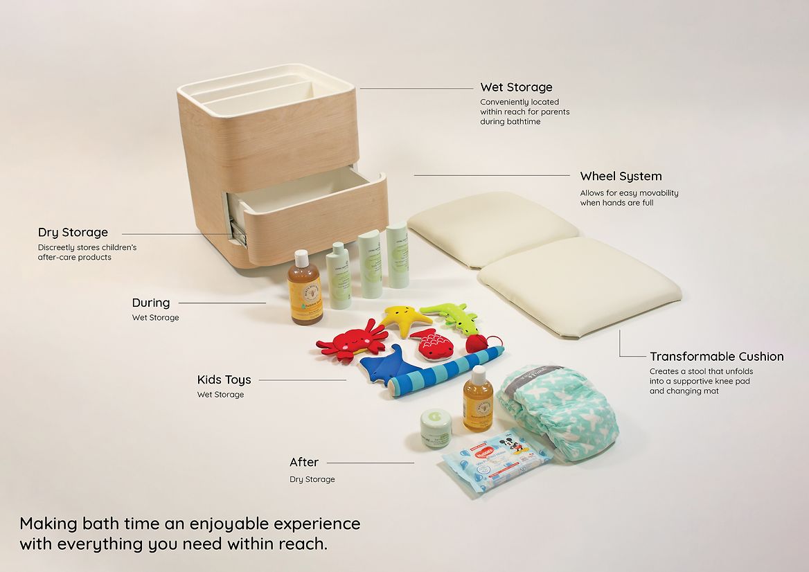 Cubby is a transformable furniture system, designed to support both the mind and body of parents of young children. Its design embodies simplicity and functionality to meet their unique needs during bath time by supporting all stages of the child's routine. Cubby brings everything within reach so parents don't have to look away.