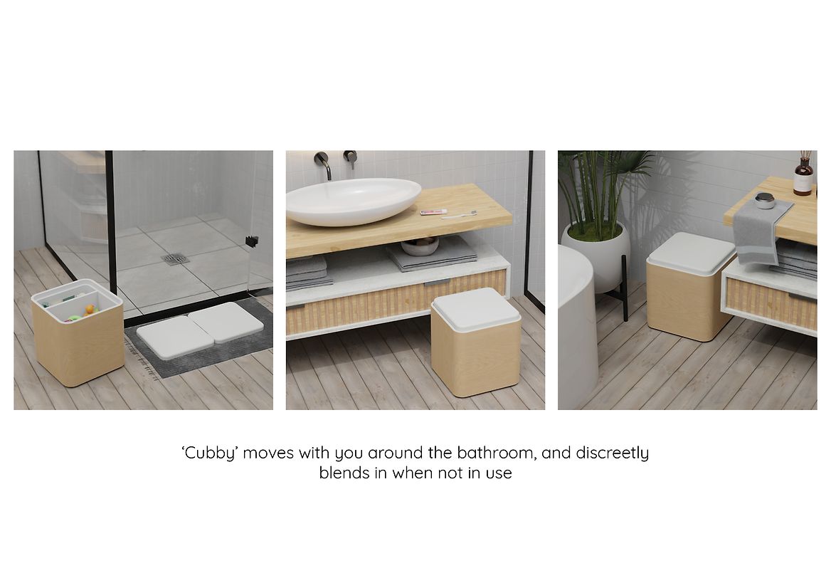 Cubby’s simplistic design provides an experience that transforms as kids' bath time routines unfold. The design is made up of wet and dry storage supported by a transformable cushion to accommodate parents' needs. The wet storage is designed to support parents during bath time. With its height and open design, Cubby enables easy access for parents and fosters children to interact with their own routines building foundations for their own independence at a young age. Cubby’s dry section is discrete and creates a space for kids' aftercare products, creating a complete routine. The cushion transforms to support parents' journey as a seat, knee pad and changing mat adapting and following throughout their routine. Cubby’s incorporated wheels allow for effortless mobility and adaptability within the whole bathroom space. Cubby’s transformative product eco-system provides support and caters to each parent's needs.