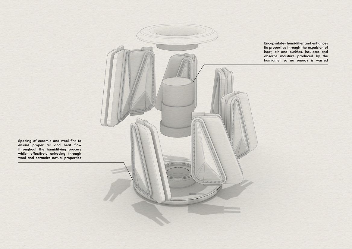 Strong wool, sustainably sourced from Aotearoa, is central to this design, offering moisture absorption, insulation, and air-purifying properties. It enhances the humidifiers effectiveness by naturally filtering the air and maintaining optimal humidity, alleviating breathing difficulties and promoting respiratory health, especially in developing children. Paired with ceramic components that ensure even heat distribution throughout the wool components, EverCloud delivers consistent, energy-efficient performance. The combination of these features fosters a calming environment that promotes relaxation, improves sleep quality, and provides warmth benefiting both physical and mental well-being.