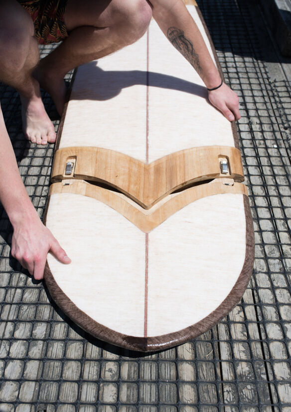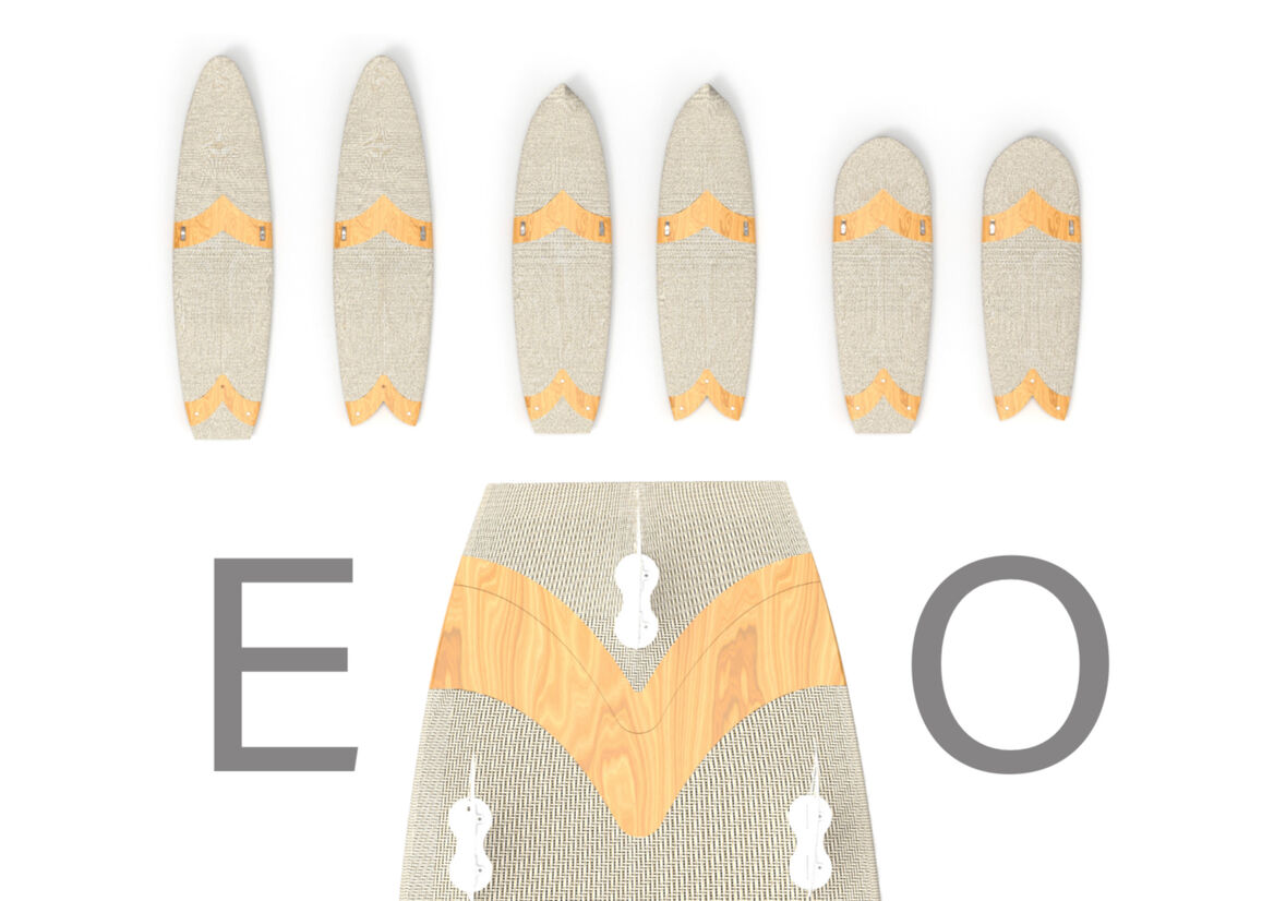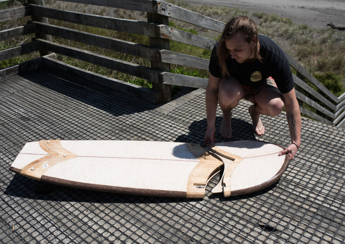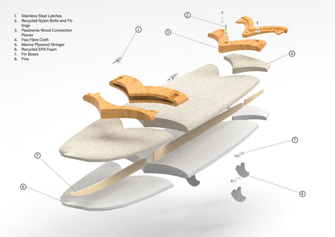 Currently, an estimated 400,000 - 600,000 surfboards are produced each year (Dodds, 2020). It is estimated that 170kg – 250kg of CO2 emissions are released during the manufacturing process of each board (“Surfboards and their hidden environmental impacts”, 2020) while the average surfer owns about 4 boards. With an increasing number of new people taking up the sport, I wanted to focus my project around a surfer’s experience from beginner to intermediate level. The EVO board provides a pathway of board shapes that evolve with the user, matching the needs of their progression as their ability advances. It starts with a mini-mal (longboard) shape, moves on to a funboard (mid-length), Fish board, and finally ends up at a groveller shape. As the length of the board is shortened, it becomes more suitable for different wave heights from small to mid-level waves. Having the ability to reduce the board down to three pieces makes this board easier to store at home and transport to the beach. It will easily fit into a closet as well as the boot of a car eliminating the need for roof racks or laying down the backseats in the car. Once you master all of the different shapes, you can change the shape according to the surf conditions without having to bring up to 4 different surfboards with you. To assemble the board, all you need to do is insert the nose component into the body component and flip the latches to secure them together. The tail component is then inserted into the other end and bolts are screwed in. It is estimated that ’80 % of surf equipment comes from the petrochemical industry’ (“Surfboards and their hidden environmental impacts”, 2020), so rather than using standard oil-based materials, I turned to recycled and more natural alternatives. The EVO board uses the same body section and can be changed to three staple board shapes. This reduces the amount of material used by 75% which will reduce waste in the long term. The recycled materials I used were recycled polystyrene for the foam core and recycled nylon for the bolts and fittings. For the more natural materials, I used native New Zealand paulownia timber for the connection parts, Super Sap epoxy bio-resin for the outer coating and natural flax fibre cloth instead of fibreglass. By using natural and waste materials while reducing the amount of material used, this board is taking a step in the right direction for a more sustainable future.