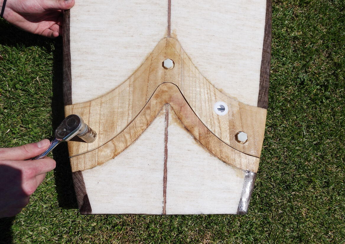 It is estimated that ’80 % of surf equipment comes from the petrochemical industry’ (“Surfboards and their hidden environmental impacts”, 2020), so rather than using standard oil-based materials, I turned to recycled and more natural alternatives. The EVO board uses the same body section and can be changed to three staple board shapes. This reduces the amount of material used by 75% which will reduce waste in the long term. The recycled materials I used were recycled polystyrene for the foam core and recycled nylon for the bolts and fittings. For the more natural materials, I used native New Zealand paulownia timber for the connection parts, Super Sap epoxy bio-resin for the outer coating and natural flax fibre cloth instead of fibreglass.