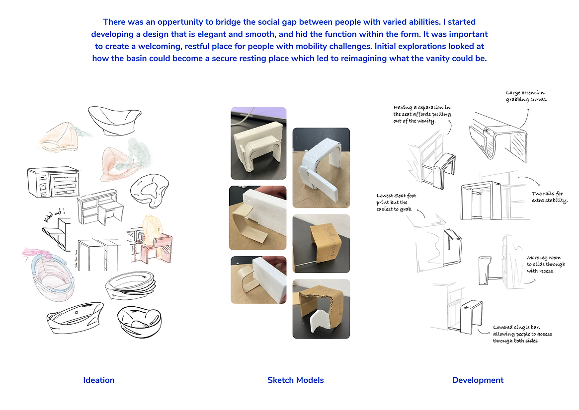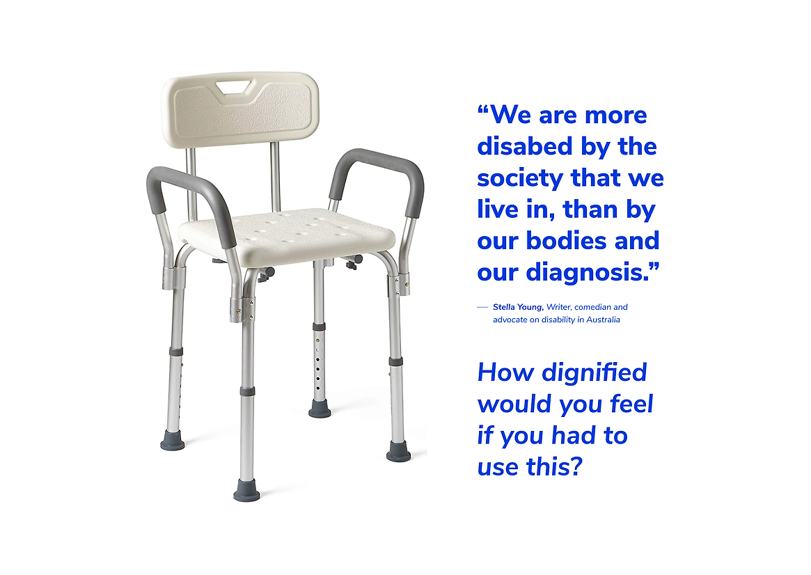 Assistive products designed for disabled people are often clinical and undignified. For those who must use these products, their experiences can negatively impact their social life and mental health. Consequently, many are insecure about using assistive products in their bathrooms. Assistive products designed without empathy for their users can also make able-bodied people in shared situations feel uncomfortable or awkward when they encounter them. To create a welcoming environment and promote inclusivity, I wanted to design an assistive product that could be used by all ages and abilities — one that is gracious and discrete. Rather than creating something new, I wanted to build a solution from an existing product, to avoid further unnecessary stigmatisation of an underserved user group.