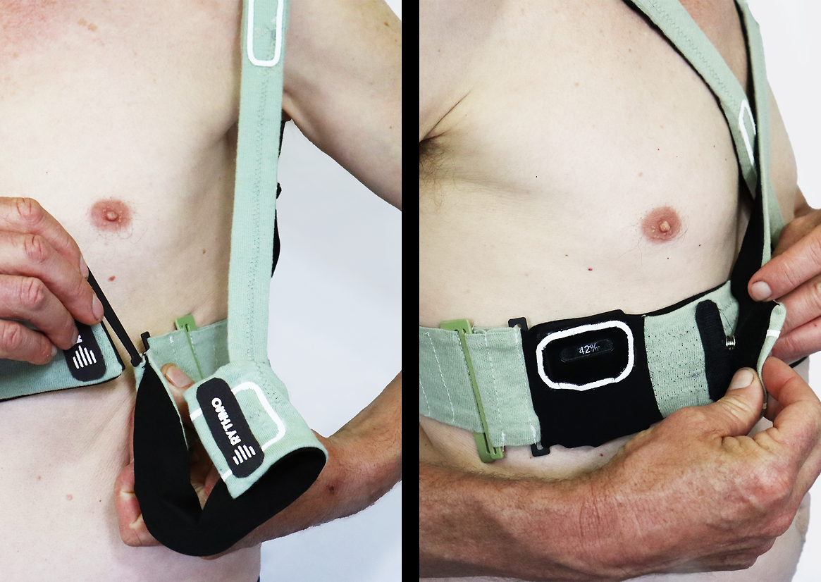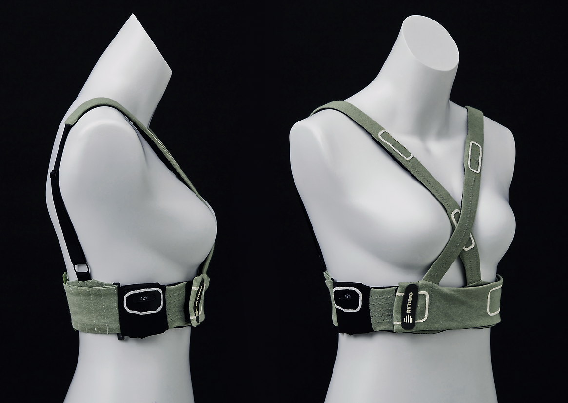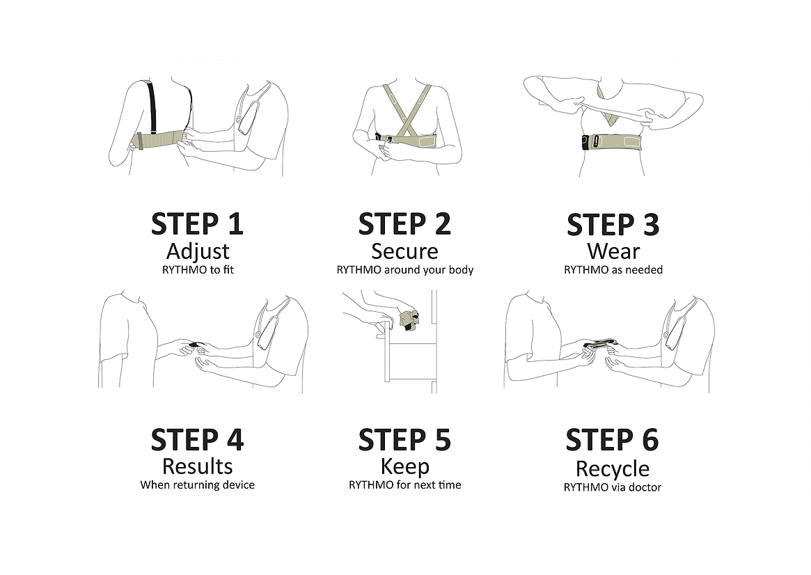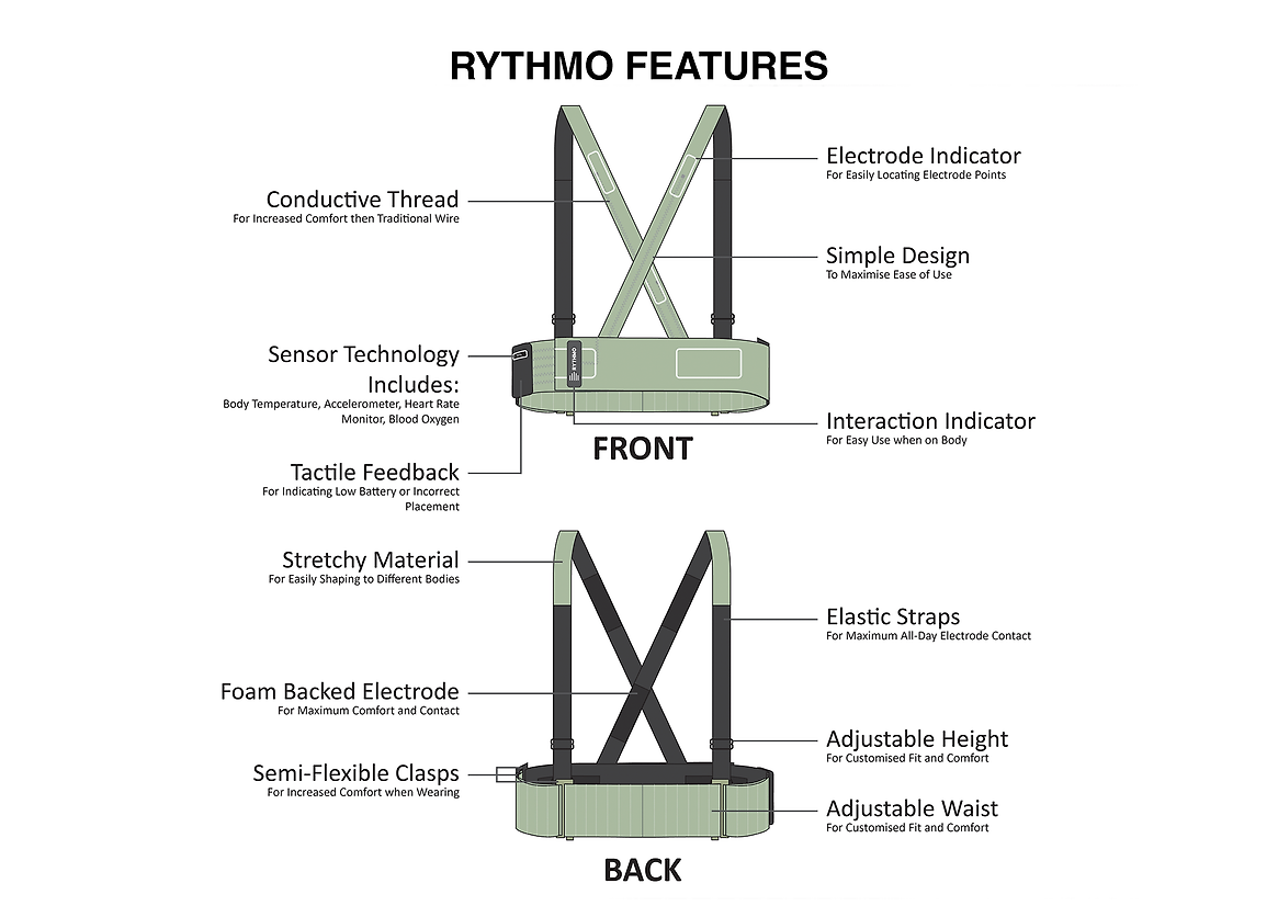 RYTHMO has an x-shaped design that allows the design to be worn by all genders. For maximum adjustability, there are straps on the waist and back for the perfect fit by a health professional (reducing the misuse of the product). The stretchy materiality allows for all-day comfort during activities as it can adapt and stay secure to the body throughout different movements. It also can withstand sweat due to the breathability properties of the lyocell tencel material and the use of dry electrodes. Further, the product can be cleaned during use as the material component can be easily separated from the technology hub for washing when dirty.