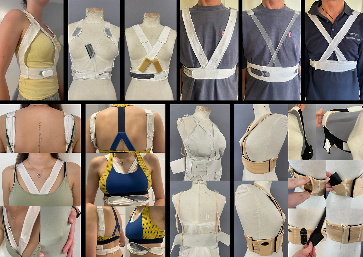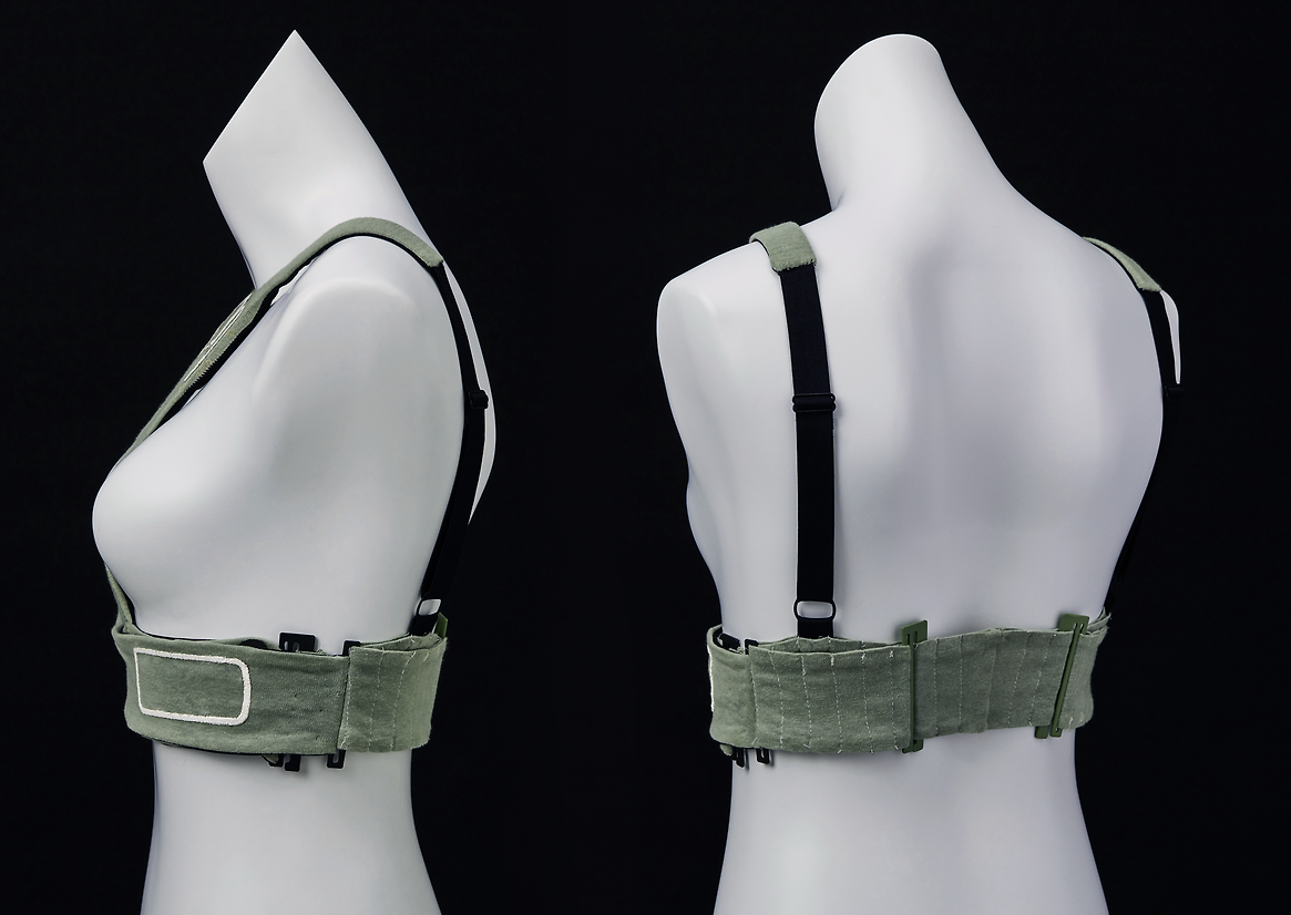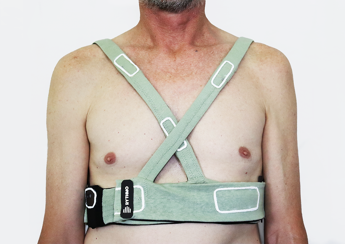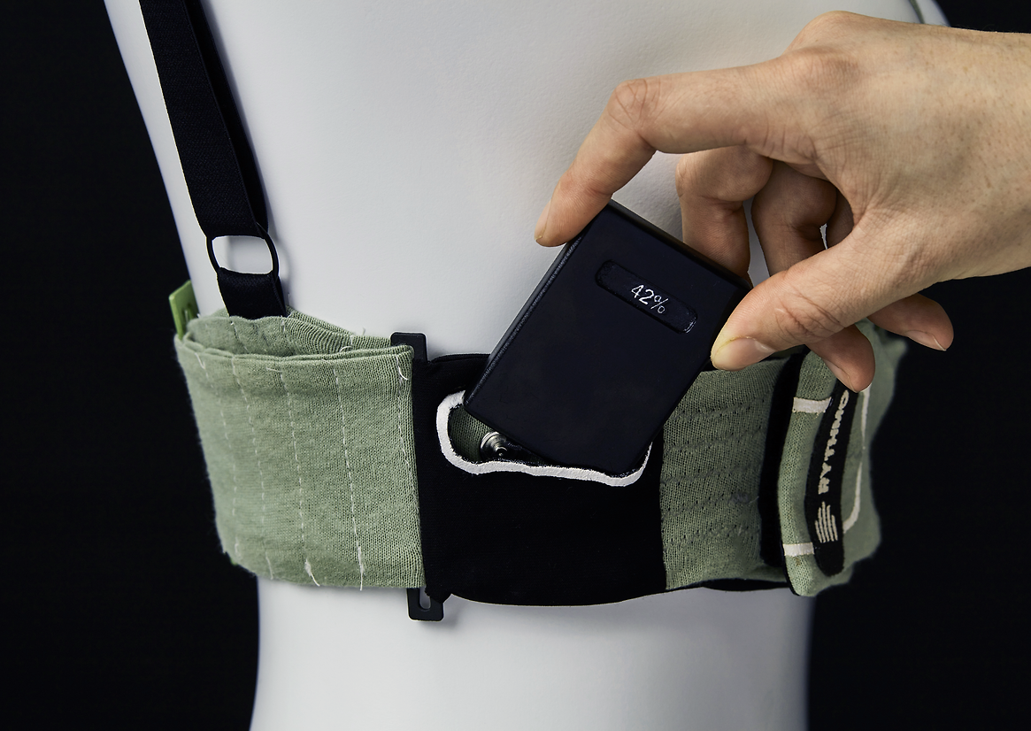 RYTHMO has an x-shaped design that allows the design to be worn by all genders. For maximum adjustability, there are straps on the waist and back for the perfect fit by a health professional (reducing the misuse of the product). The stretchy materiality allows for all-day comfort during activities as it can adapt and stay secure to the body throughout different movements. It also can withstand sweat due to the breathability properties of the lyocell tencel material and the use of dry electrodes. Further, the product can be cleaned during use as the material component can be easily separated from the technology hub for washing when dirty.