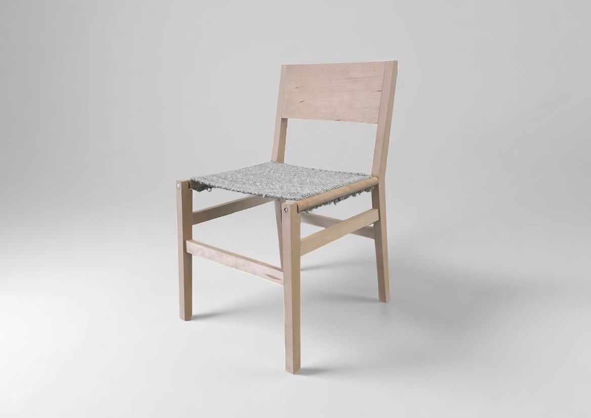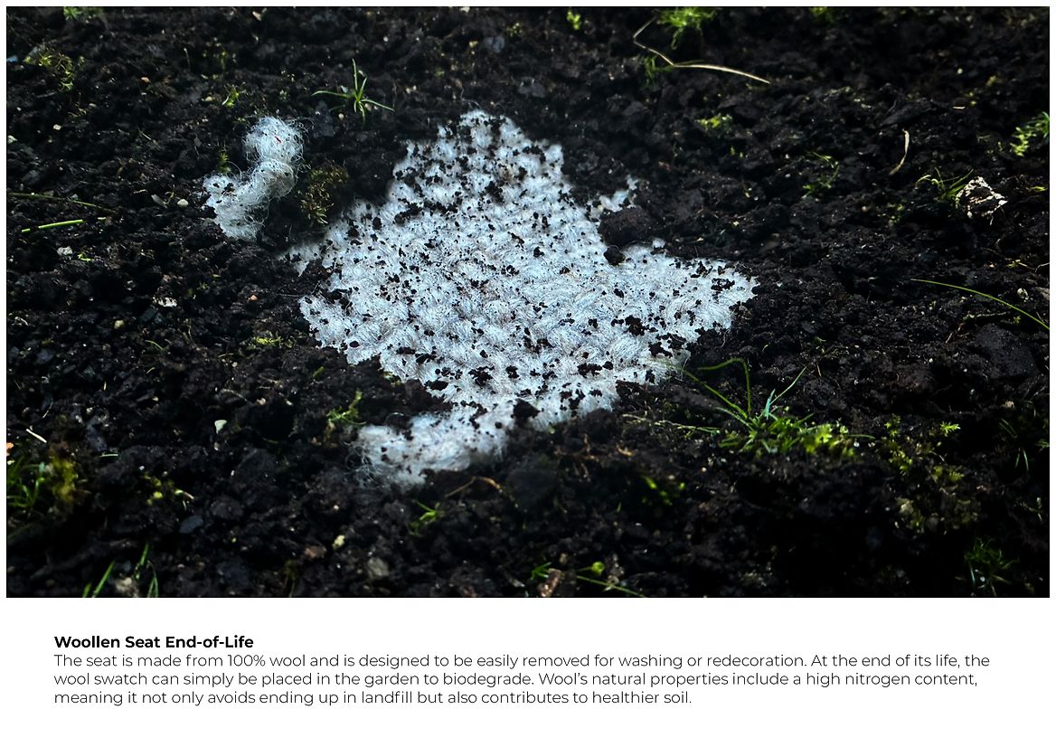The Ewe Chair supports circular design values. When the seat swatch wears out or the user wants a new look, it can be returned, heat-shrunk back to a tight weave, and repurposed. Alternatively, it can be composted to enrich the soil, allowing interiors to evolve without waste. The wooden frame is deliberately minimal, acting as a backdrop that lets the wool material shine.