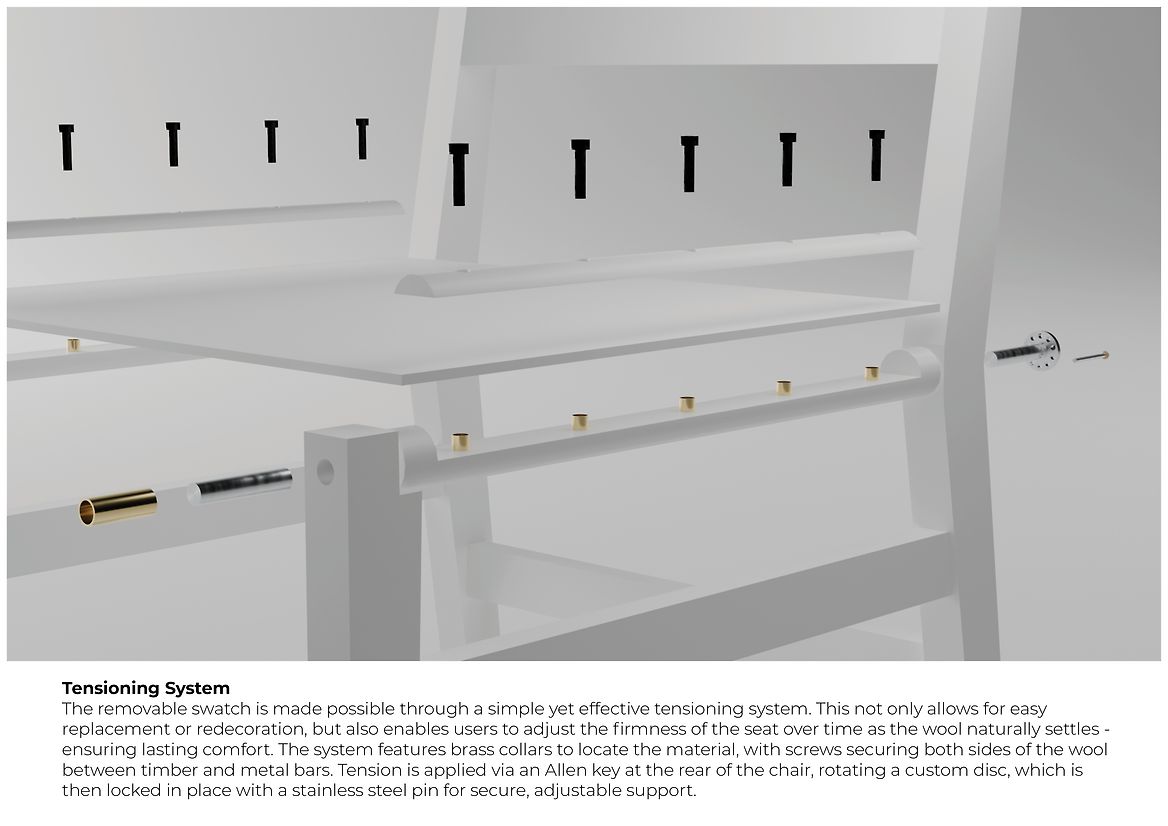 A key feature is the interchangeable wool seat swatch, which can be removed, washed, replaced, or adjusted over time. A simple tensioning system allows users to modify firmness as the wool settles, ensuring long-term comfort. The swatch is designed to be easily swapped using just an Allen key and locking pin.