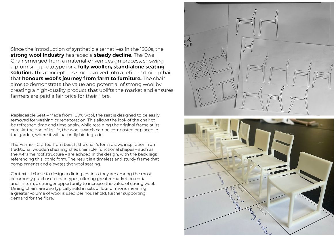 The Ewe Chair was designed in response to the steady decline in the market value of strong wool, which has become so undervalued that shearing often costs more than the wool itself earns. Yet, wool remains a far superior, sustainable natural fibre with properties that synthetic alternatives cannot replicate. This project explores innovative, high value uses for strong wool, aiming to elevate its worth and ensure fair returns for farmers.