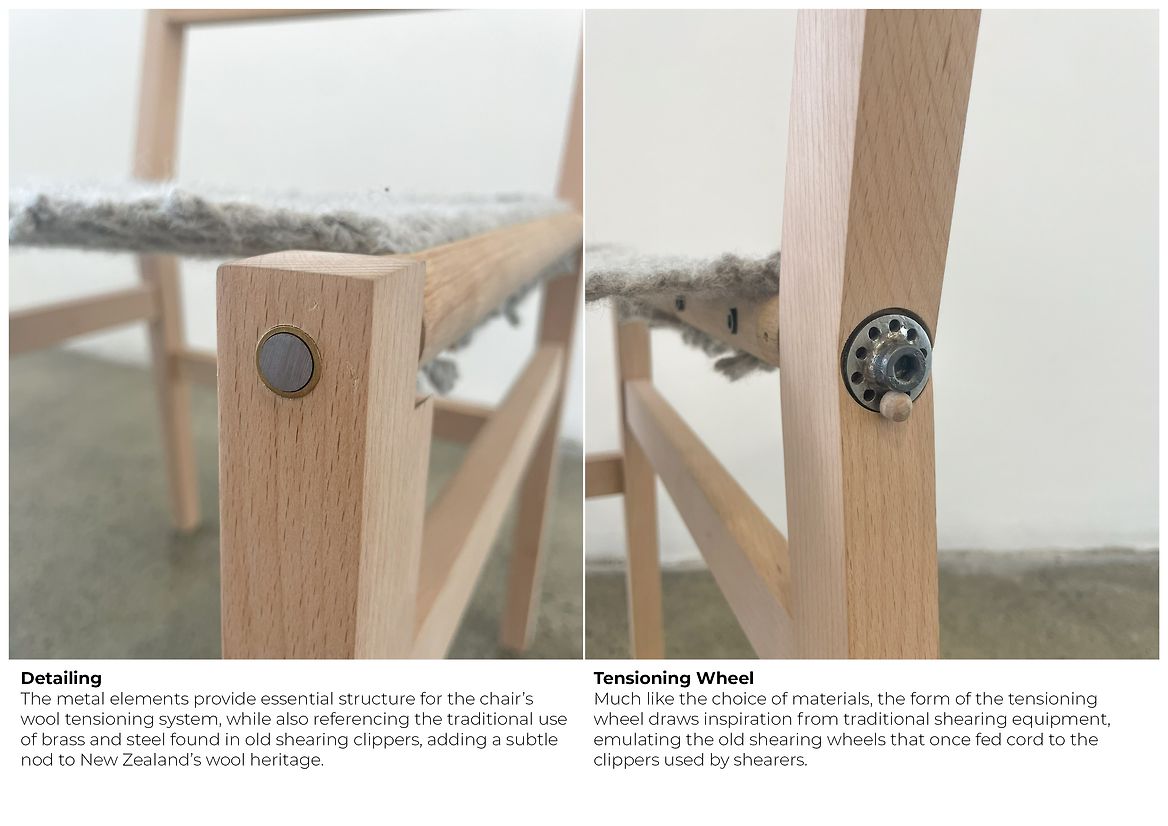 The chair’s aesthetic and structure pay tribute to wool’s agricultural origins. Angled back legs and the form of the backrest take cues from the A-frame roofs of traditional shearing sheds. Exposed supports reference open ceilings, and brass/stainless-steel details echo the fittings of old shearing pulley systems. The result is a chair that feels both purposeful and refined, designed to sit quietly but confidently within the home.