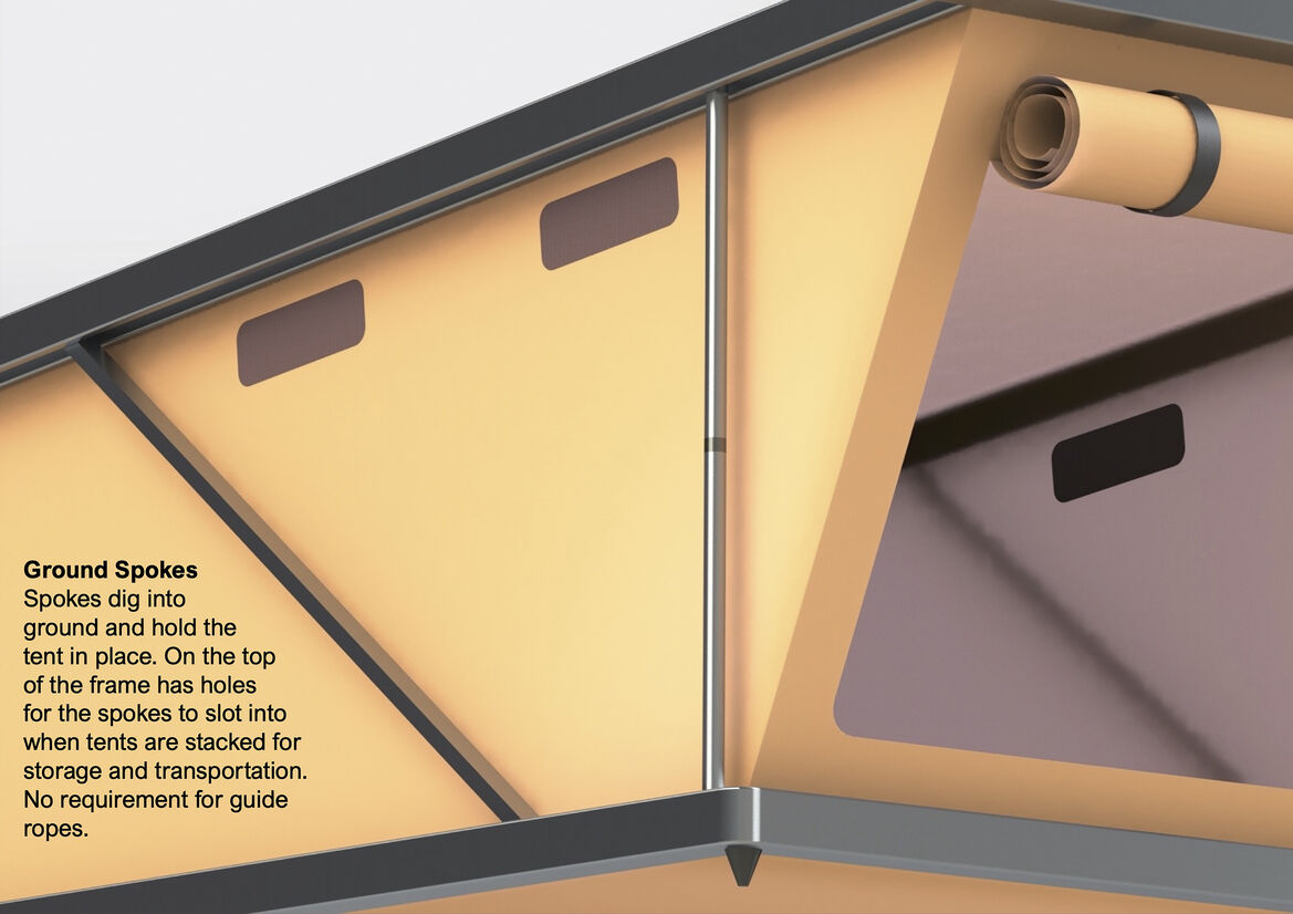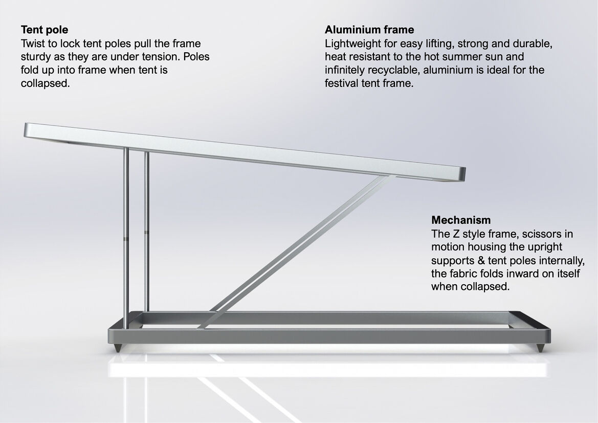 Festival staff can erect each tent in minutes, allowing them to set up many of them quickly. Tents collapse and stack on one another for easy transportation and storage, reducing emissions. No requirement for guide ropes, spokes on the base and its own weight hold the tent to the ground, eliminating tripping hazards and allowing them to be pitched much closer together. User can replace damaged parts with the festival organiser. Staff collect tents at the end of the festival eliminating the problem of damaged/unusable tents being left behind and dumped.