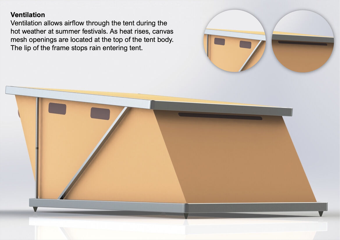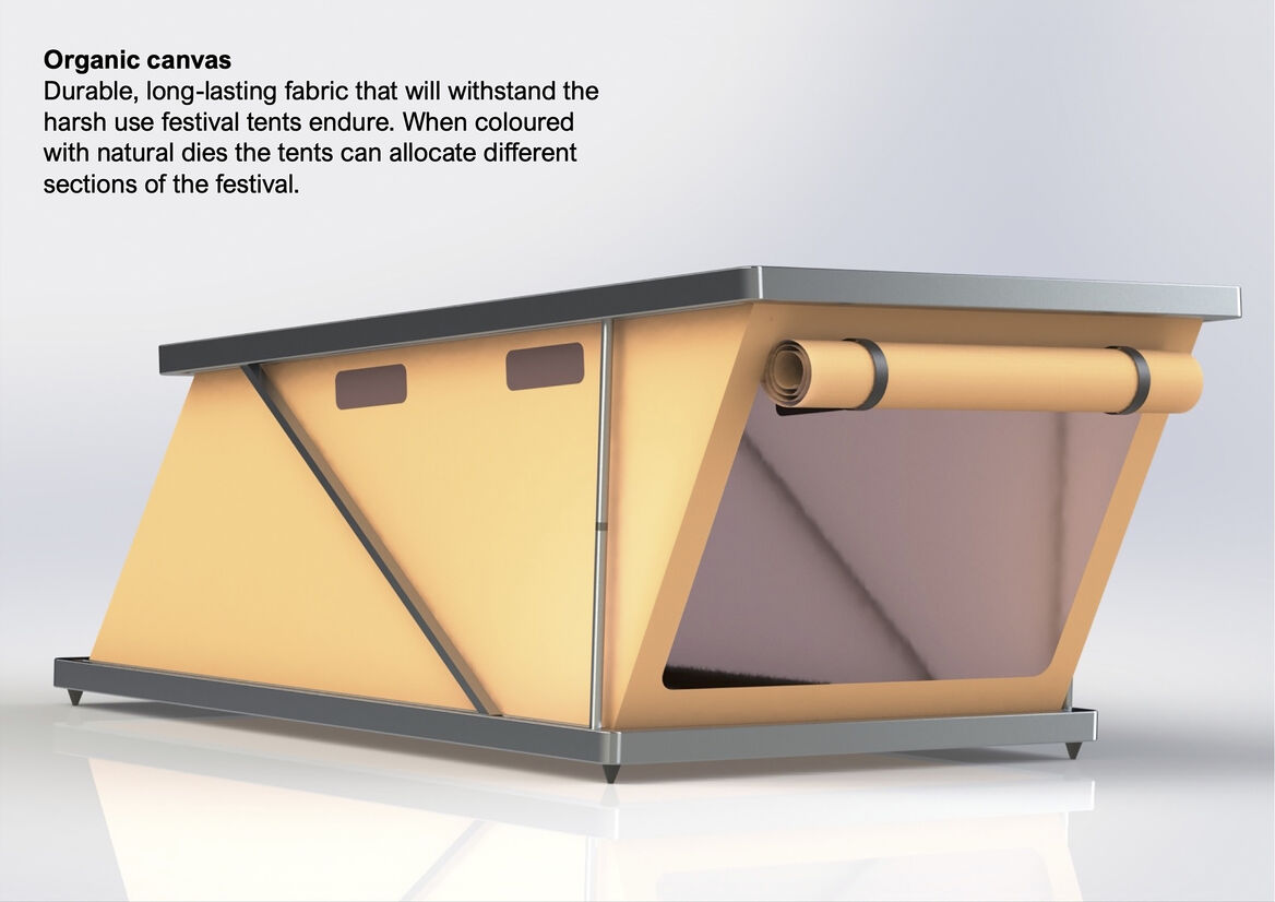 These festival tents are made with 3-4 materials (Aluminium, organic canvas, natural dyes and beeswax) much less than current tent construction. These materials are sustainable and environmentally friendly. Aluminium is 100% recyclable and organic canvas is a natural fabric made from cotton. Fewer materials mean less manufacturing time, therefore reducing energy usage and pollution. Being dedicated to festivals, these tents are in storage during the off seasons meaning they aren’t in retail stores which constantly use energy. Festival-goers can enjoy the festival experience without having to worry about their own tent. People aren’t buying cheap and unsustainable tents, leaving them behind and adding to the increasing landfill problem. To change or repair parts, the tent is modular which helps to simplify the recycling process. After the festival, the event staff collect the tents and stack them in trucks. The compact design allows more tents to be transported at once which helps to reduce fossil fuel consumption and emissions. Damaged aluminium parts are sent to be recycled/repaired and organic canvas is patched repaired or disposed of to bio-degrade.