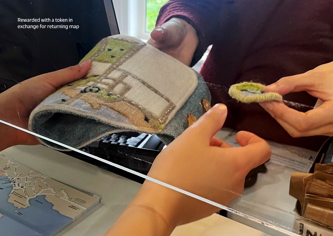 The dynamic network of information centres and transport hubs is key to a connected service. There is a four-step buy, hire, explore and reward system where “buy” is consistent across the tourism network, while the “hire, explore and reward” features are unique to each town. The strap is purchased once, and maps are hired at each town's information centres. The maps are returned and exchanged with a token that represents the town. The number of memories and tokens grows, reminding them of their experience with each town when their travels end.