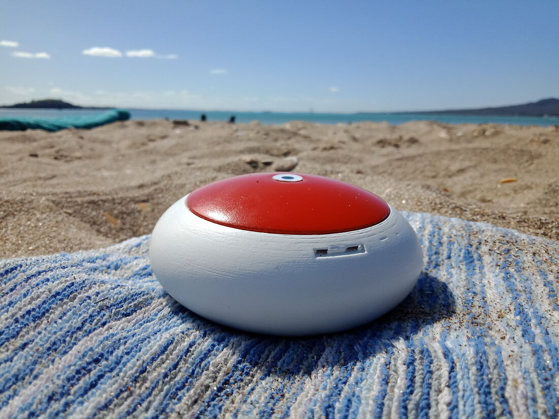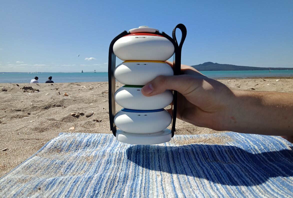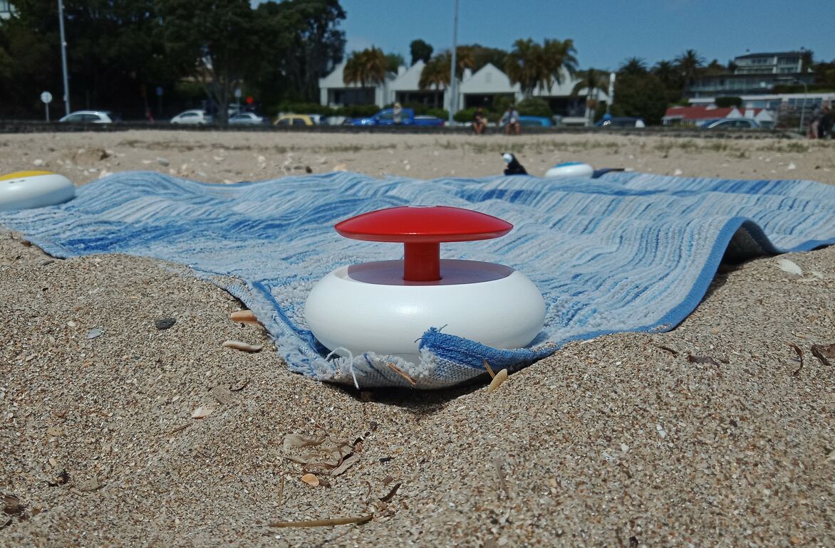 The stones function as towel weights that remind users to reapply sunscreen. They can be assigned to individual user profiles that are managed simultaneously through the app. Data is gathered from built-in UV sensors, as well as personalised skincare information from user profiles to measure UV exposure and indicate when sunscreen should be reapplied throughout the day to prevent sunburn. This is communicated through live updates and notifications on the app, as well as coloured tops of each unit that rise over time; providing a visual indication of how long each user has been exposed to the sun and emphasising the suggestion to reapply sunscreen once fully risen. This design is inspired by traditional shade umbrellas.