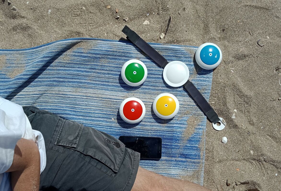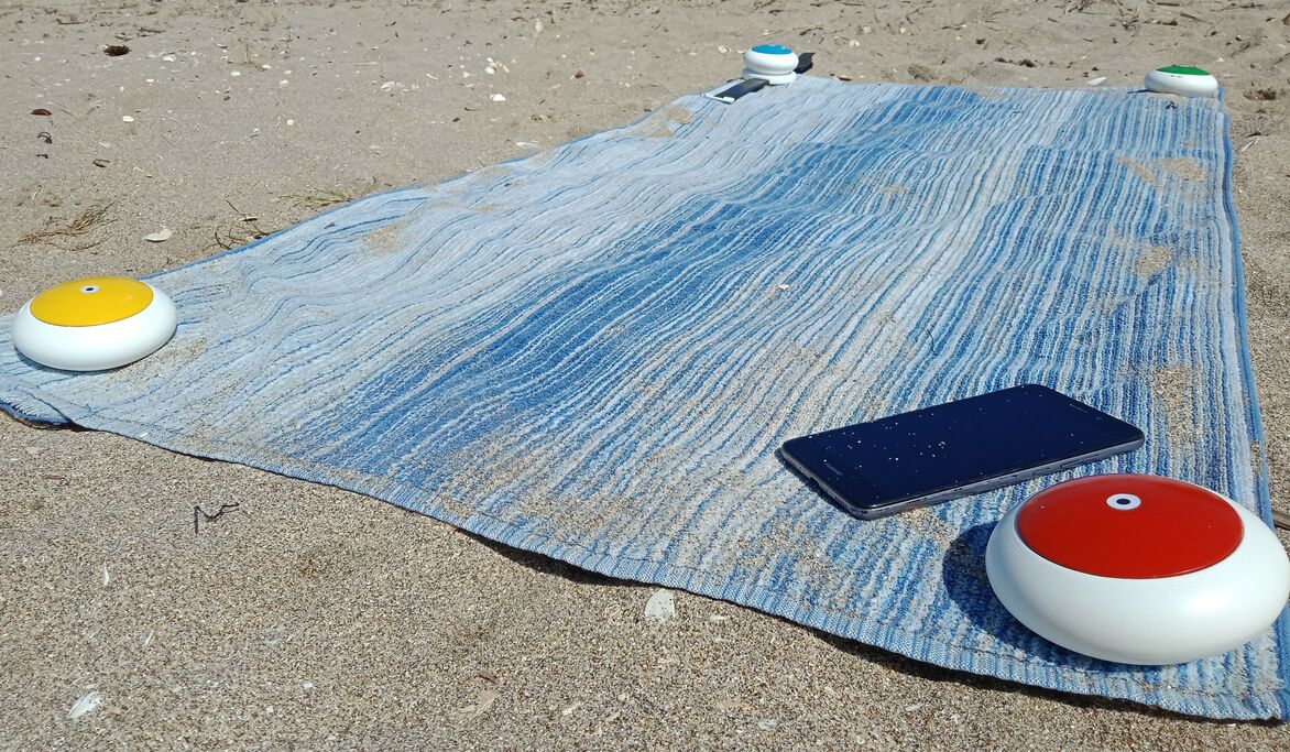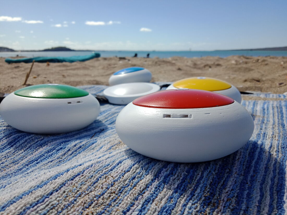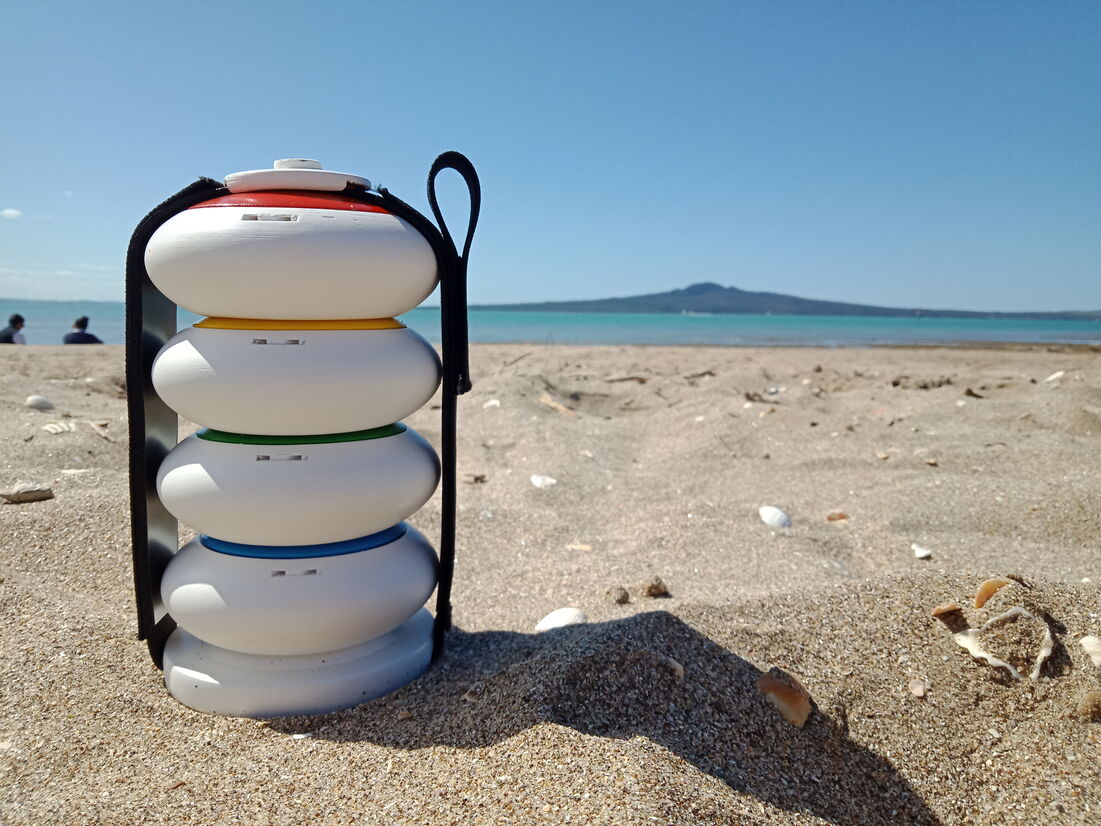 The stones function as towel weights that remind users to reapply sunscreen. They can be assigned to individual user profiles that are managed simultaneously through the app. Data is gathered from built-in UV sensors, as well as personalised skincare information from user profiles to measure UV exposure and indicate when sunscreen should be reapplied throughout the day to prevent sunburn. This is communicated through live updates and notifications on the app, as well as coloured tops of each unit that rise over time; providing a visual indication of how long each user has been exposed to the sun and emphasising the suggestion to reapply sunscreen once fully risen. This design is inspired by traditional shade umbrellas.