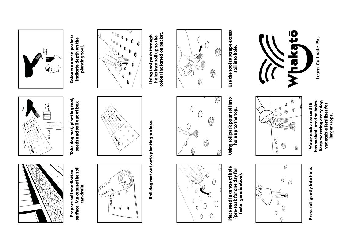 Visual instructions and implementation are designed with young users in mind. Children can simply roll out the mat in their garden, apply the tool to measure depth in the designated zones, pop their seeds into the hole, cover the holes with the soil provided, and sprinkle water onto the space. All components of the Whakatō kit from the packaging, the ink used on the packaging, the wool mat and the tool, can be broken down naturally and returned to the earth.