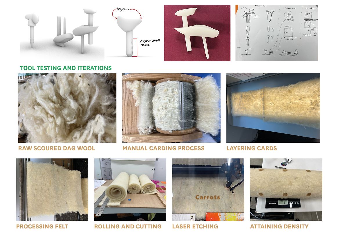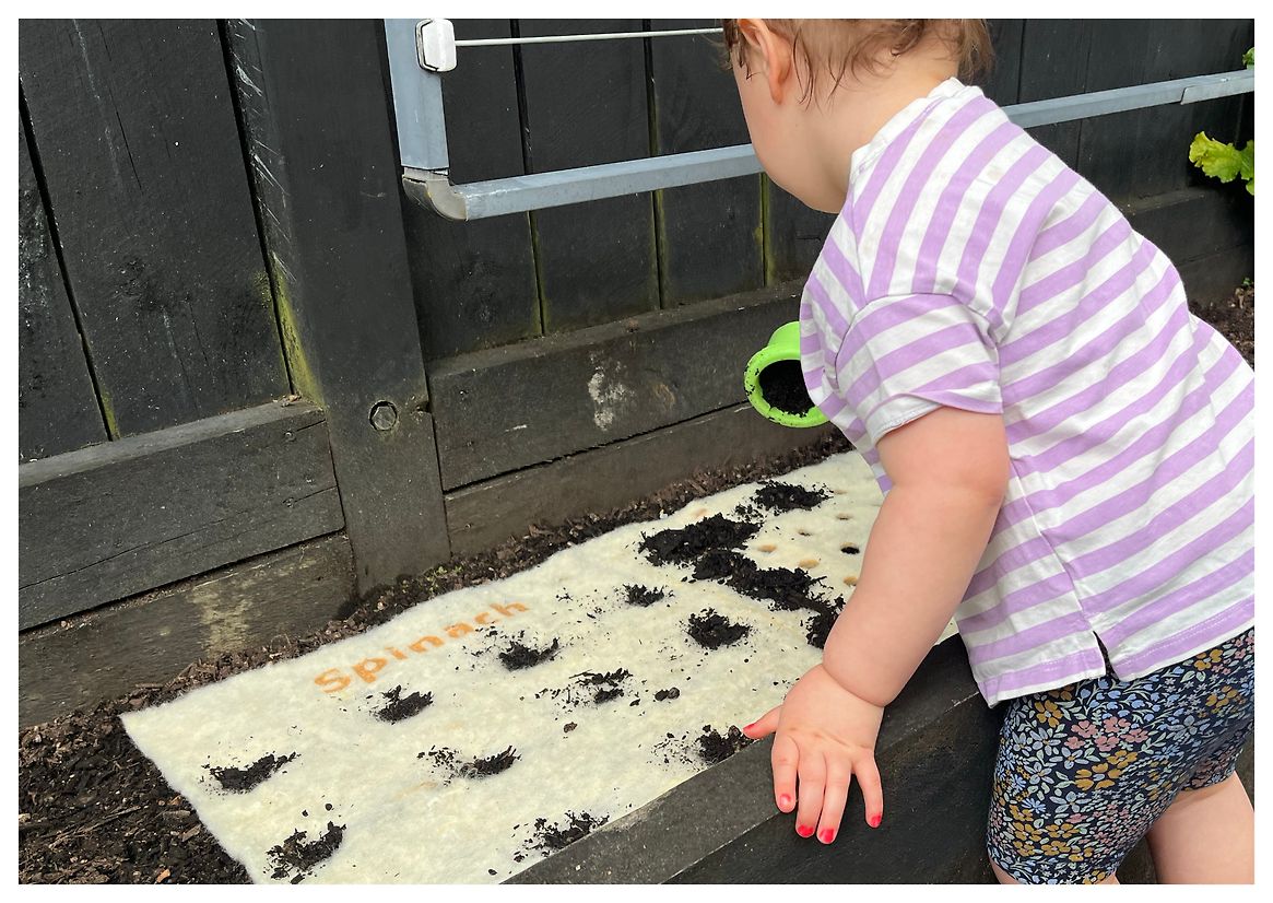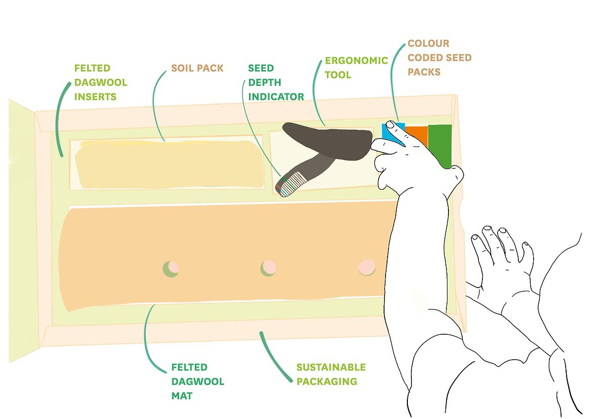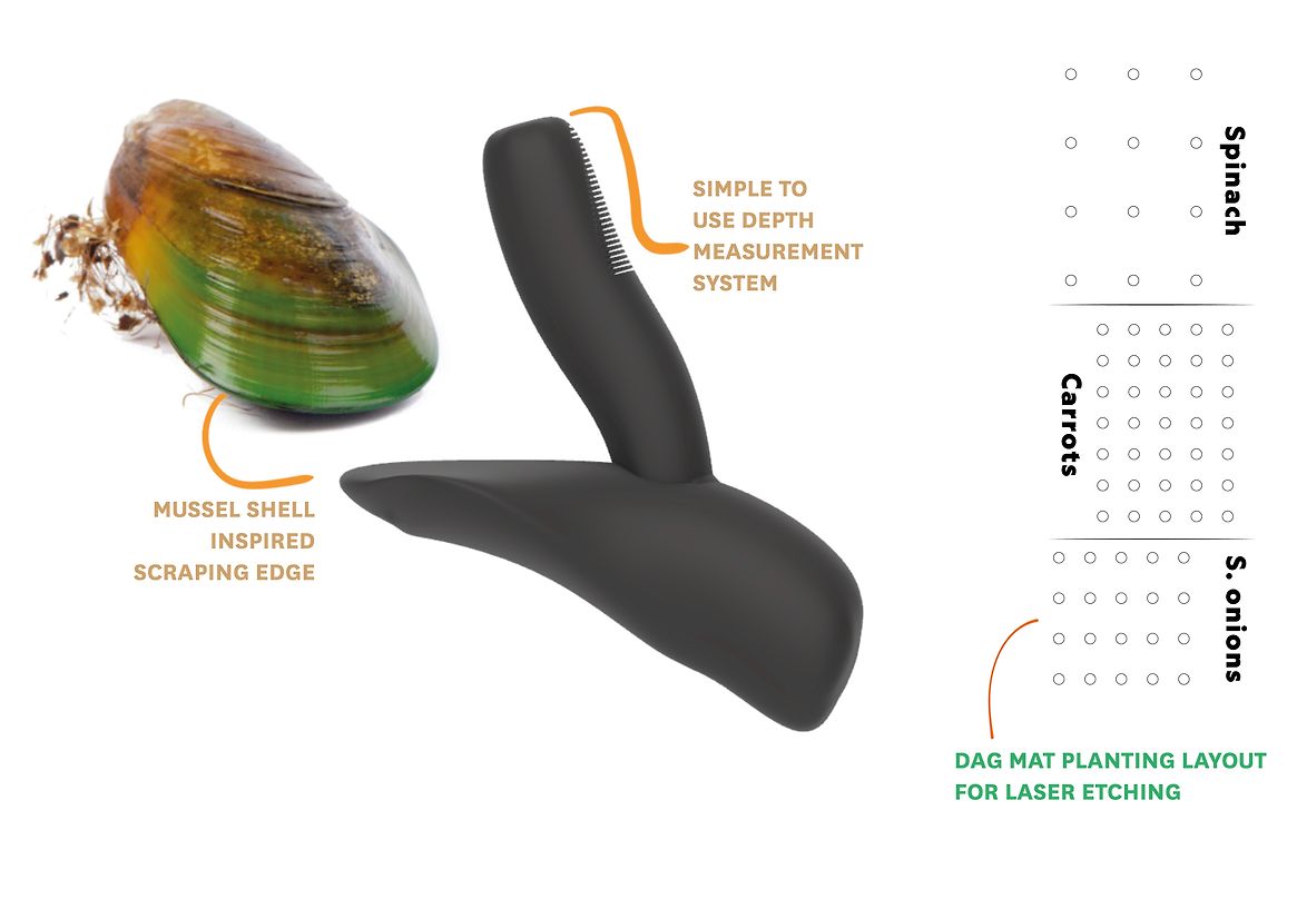 The planting mat has a carefully punched system of holes at effective spacing for planting each of the 3 seed varietals. Currently this is carrots, spinach and spring onions with the intention of introducing seasonal varietals. An ergonomic tool made from bioplastic derived from corn starch has been specifically designed for smaller hands. The tool has three functions; it allows for simple planting with a colour coded depth indicator aligned to the colours on the seed packaging, the ‘mussel’ edge can be used to scrape loose soil and the blunt ‘hammer’ edge can be used to press soil into the punched holes.