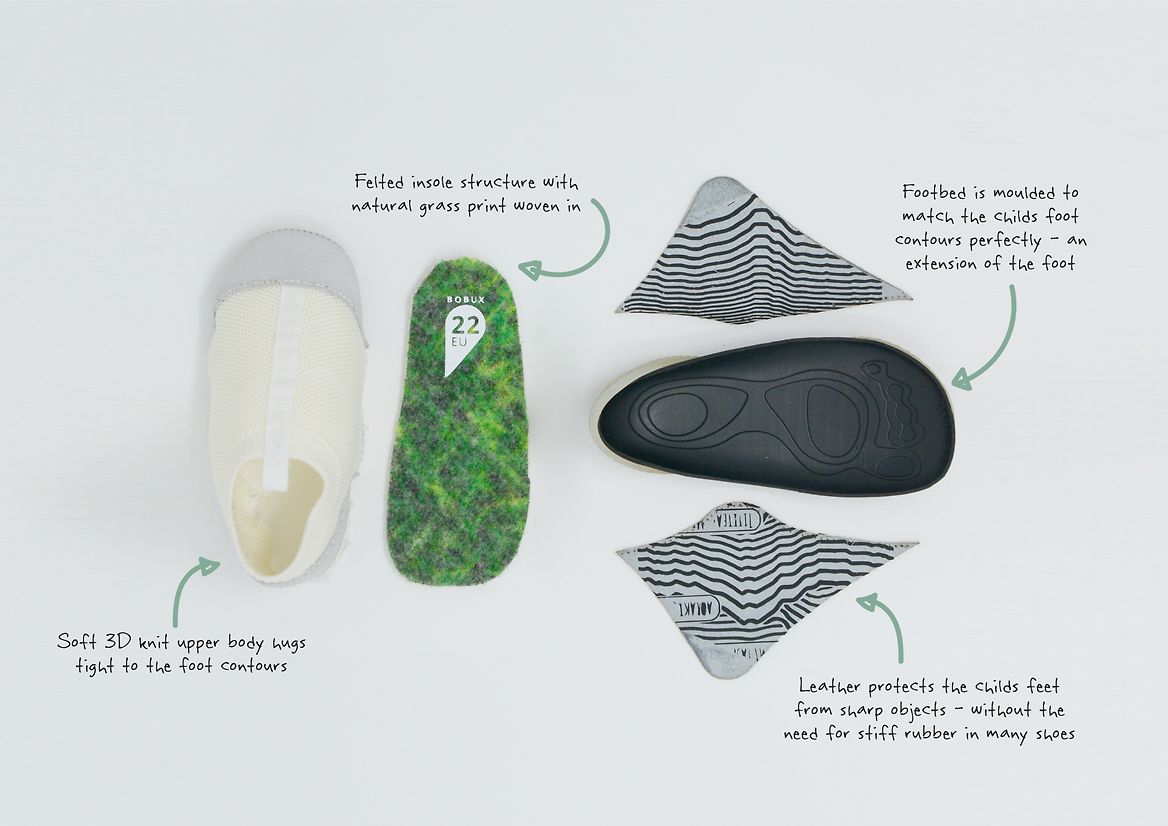 The insole comprises a felted grass print backed onto a rigid woven fabric to prevent the insole from stretching. This grass ‘look and feel’ communicates the shoe's barefoot heritage- it is as close as you can get while still protecting your child from sharp objects.