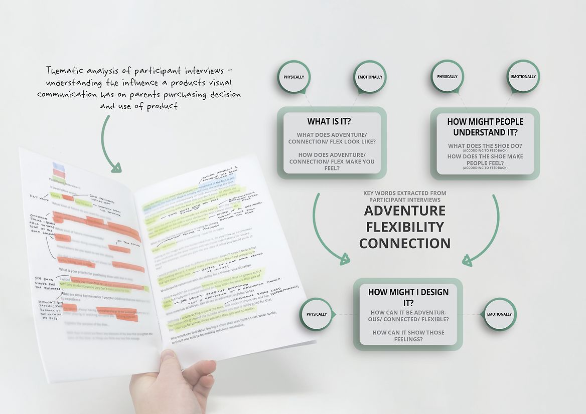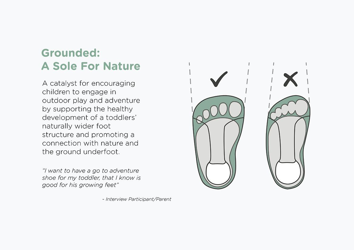 Children learn how to navigate their natural environment as they grow and learn. The shoes they wear should support this development, not hinder it. This project aimed to design a shoe to encourage and inspire children (and their parents) to engage in outdoor play and adventure.