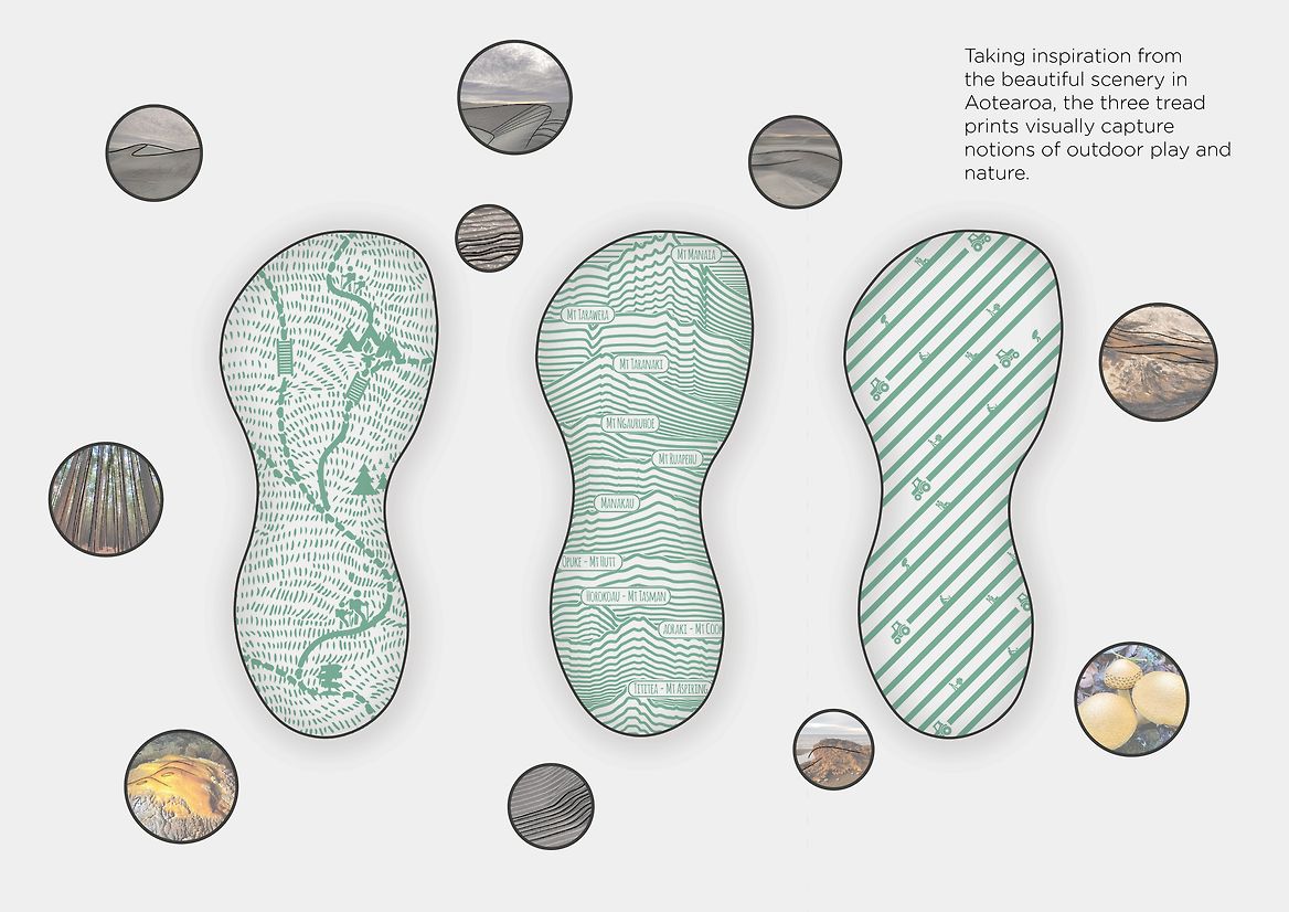 The three tread print options is visually responsive to notions of outdoor play and nature in Aotearoa New Zealand. They tell the stories of getting muddy on a farm, hanging with cows, playing on a tractor, tramping in the bush, surrounded by trees, pitching a tent and sitting around a campfire, and celebrate the mountainous ranges that run from the north to the south of Aotearoa New Zealand. Each tread tell a different story but shares the idea that each child is beginning their great adventure through life. These shoes are designed to encourage and empower this journey.