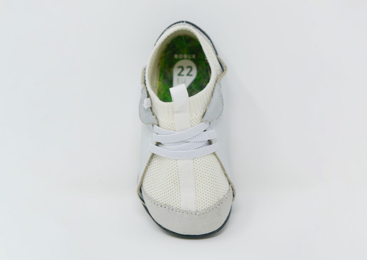 The leather wrapped around the bottom of the shoe upper protects the edges of the child’s foot from sharp objects, without the need for stiff rubber (as seen in most footwear). The leather helps with waterproofing. Soft leather is only attached along the bottom edge of the shoe to provide a more comfortable and flexible shoe structure. This allows the knit fabric to move with the foot without a thicker and stiffer fabric restricting it. The elastic laces also helped to encourage the movement of the knit fabric.