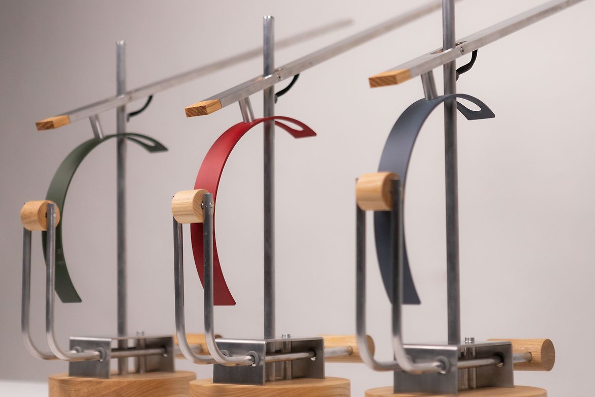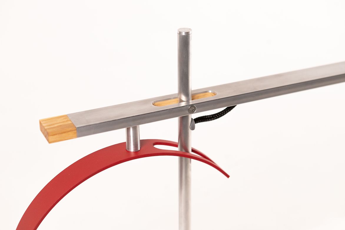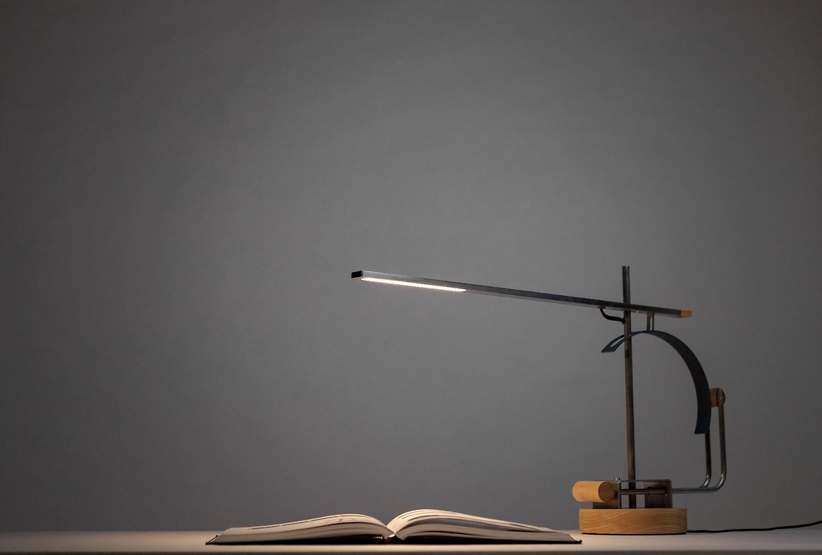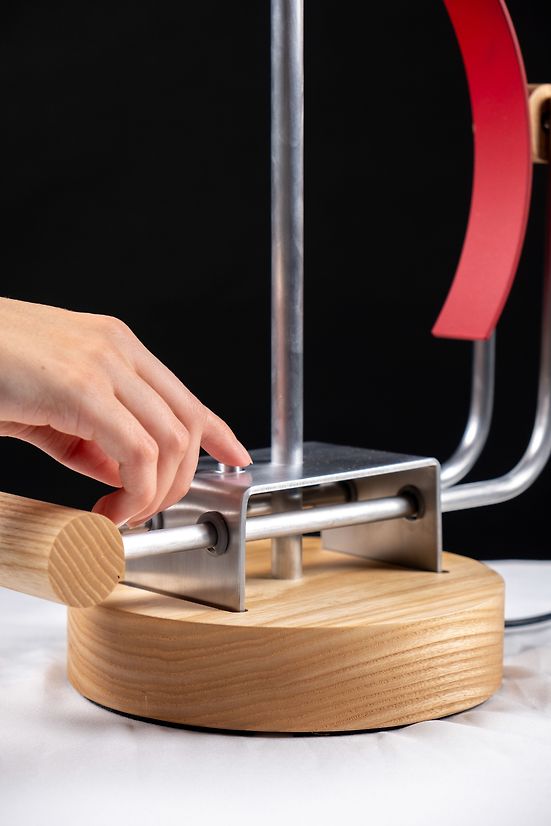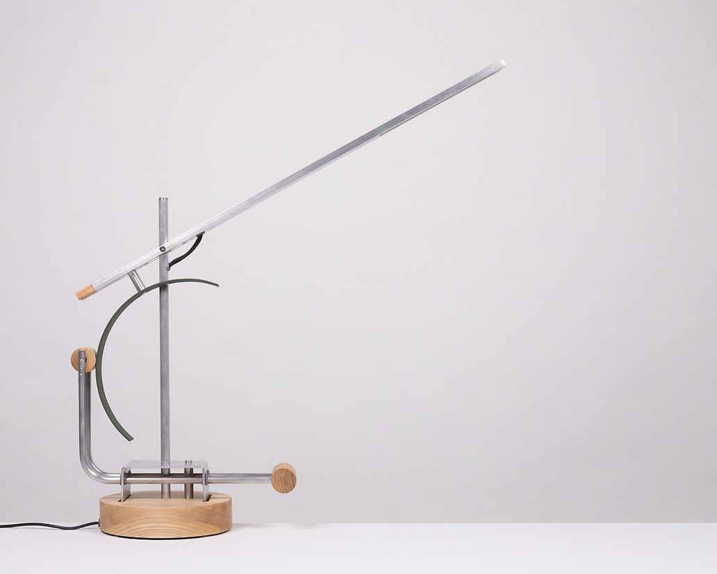 The tactility of lamp operation is assisted by materiality. American ash provides a complementary pairing with aluminium extrusions. The components are accentuated by an arc of painted steel, for which three colourways were selected to imbue personality. Steel was used for its weight density to balance the cantilevered light source, with a light aesthetic touch. The light is activated by a button placed just above the handle, thus all contact points are within reach of each other.