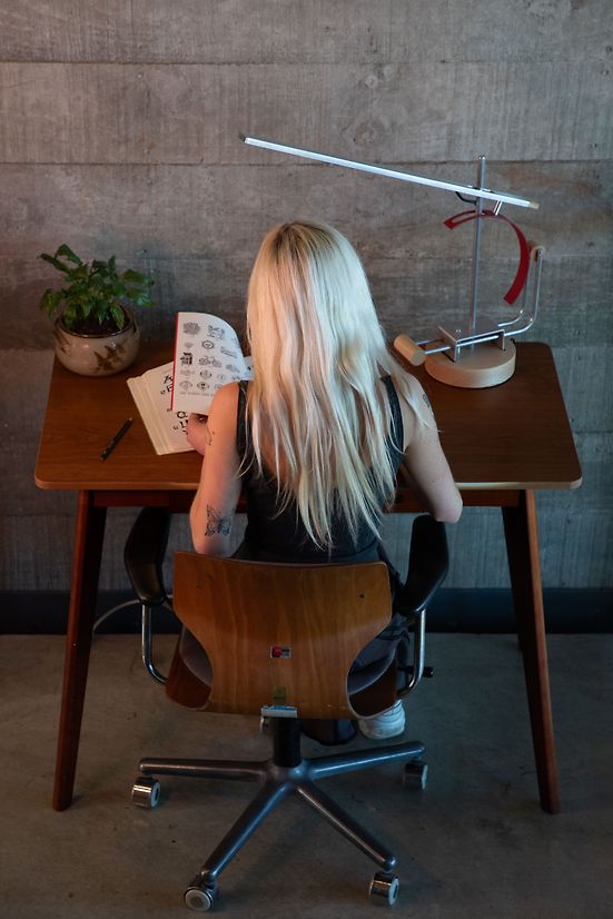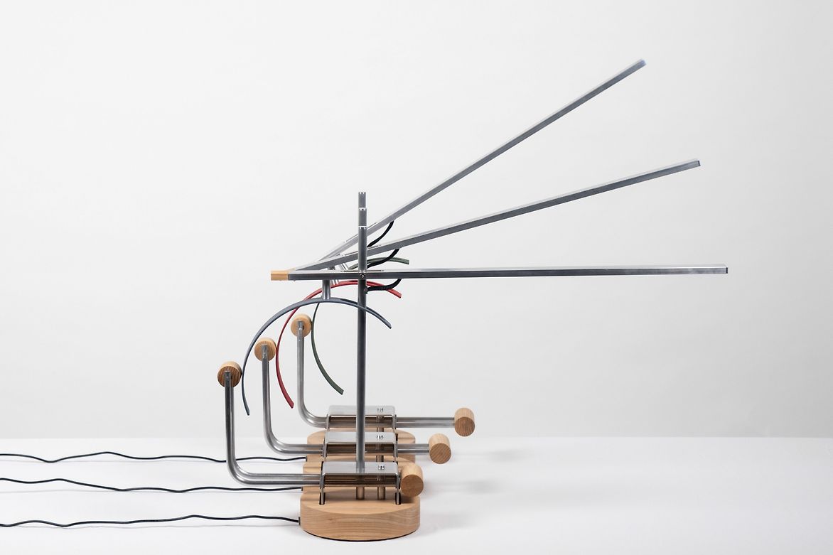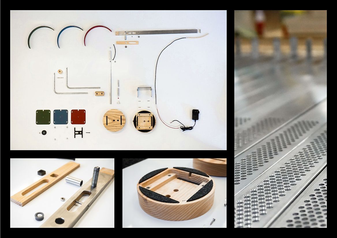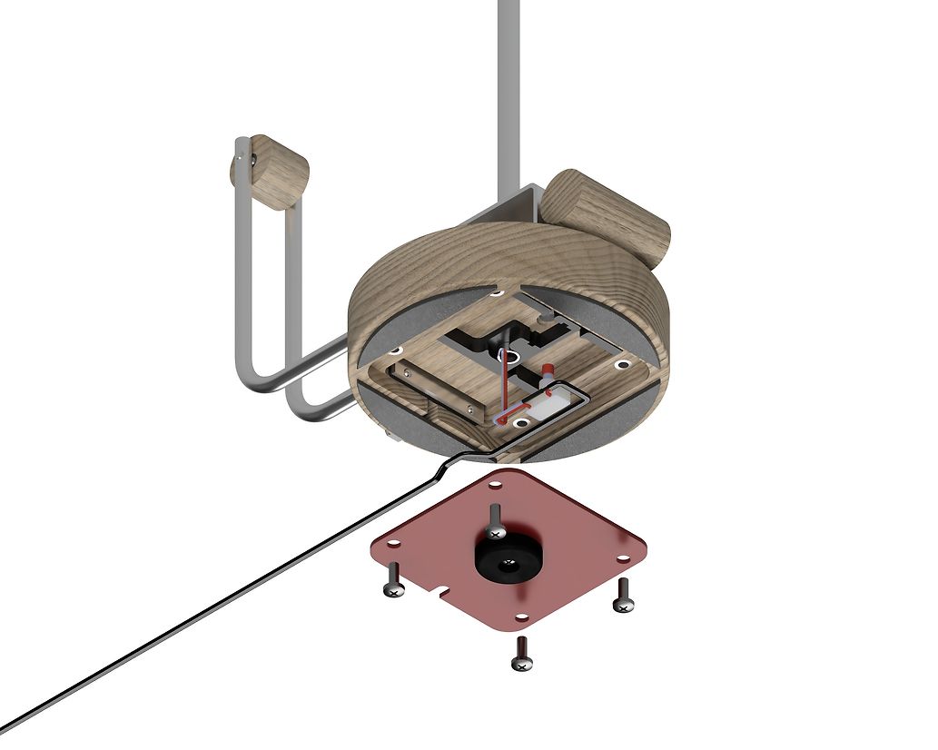 The tactility of lamp operation is assisted by materiality. American ash provides a complementary pairing with aluminium extrusions. The components are accentuated by an arc of painted steel, for which three colourways were selected to imbue personality. Steel was used for its weight density to balance the cantilevered light source, with a light aesthetic touch. The light is activated by a button placed just above the handle, thus all contact points are within reach of each other.