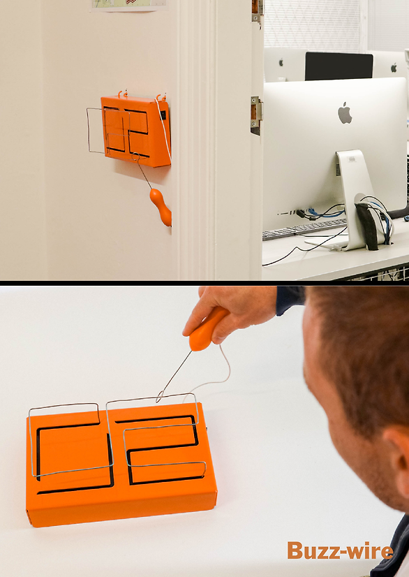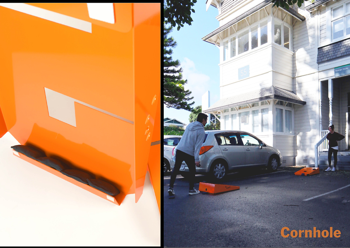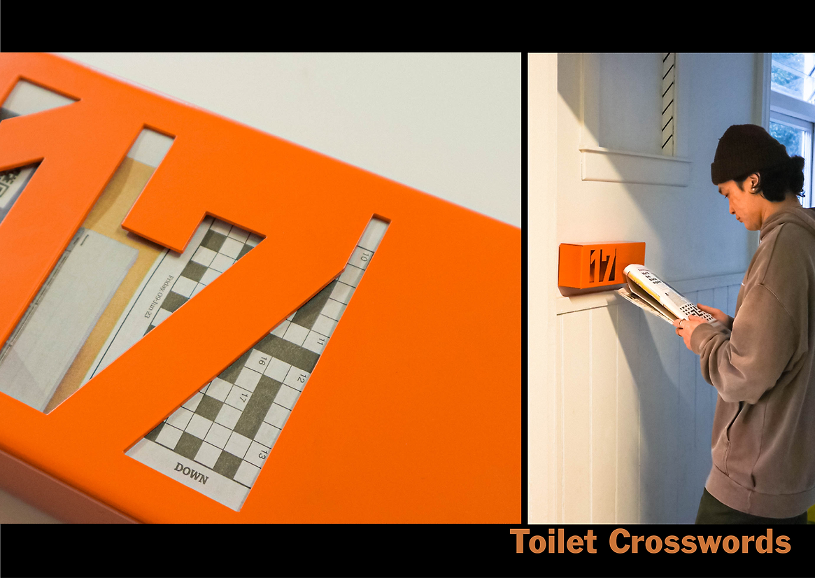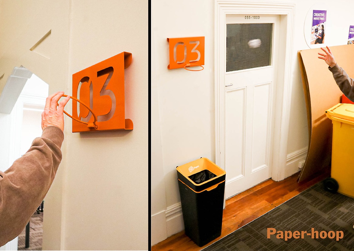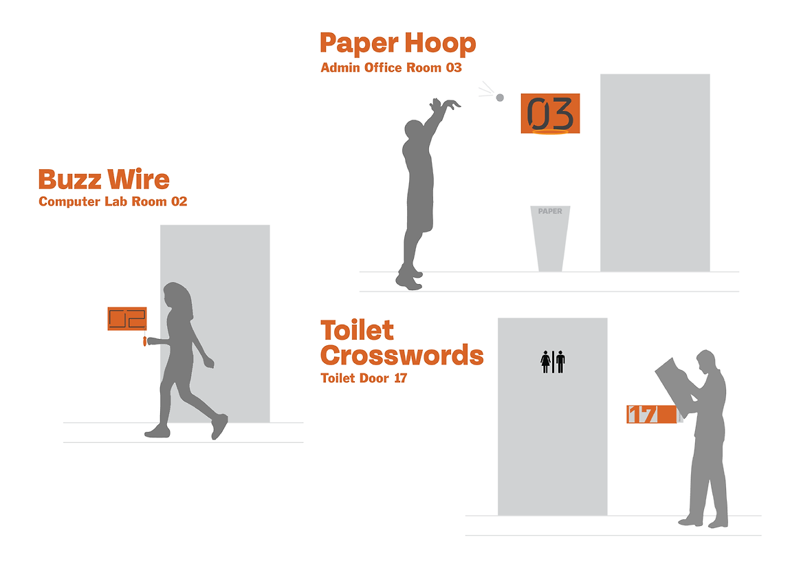 As well as my products originally being a wayfinding signage for this building, the students can also pull these down to play among themselves and interact by playing a re-designed cornhole game, buzz-wire, or shoot paper balls into a hoop, or even taking their time for a toilet break by solving crosswords or reading a paper.