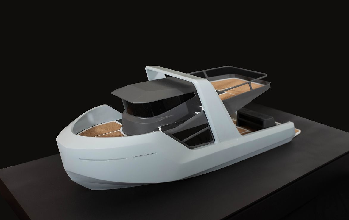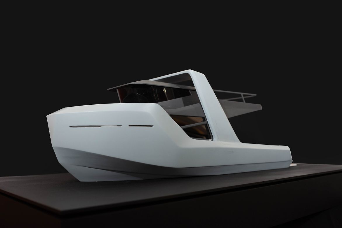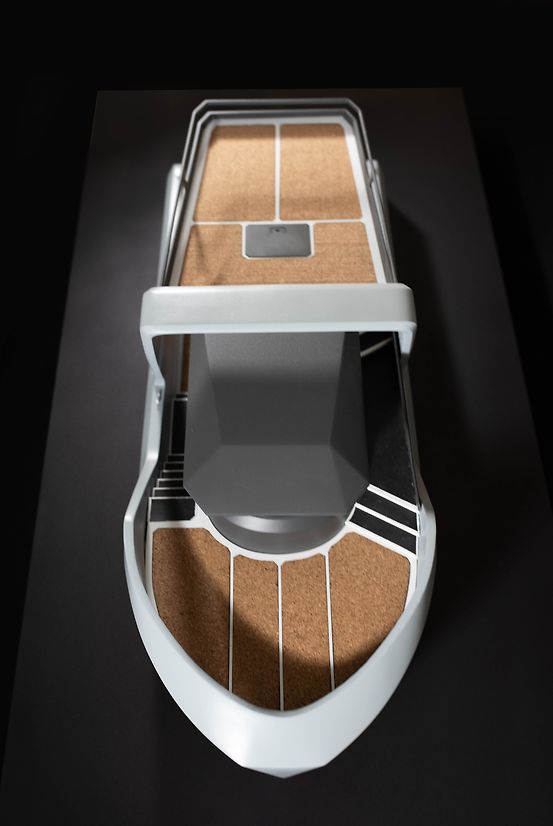 Following the project brief, the design was translated from a digital space that included CAD, VR, digital illustration, and AI image generation, into a physical scale model. The model primarily utilized 3D printing techniques, incorporating both FDM and SLA technologies. Following the printing process, the model underwent meticulous hand finishing and painting. The decking material chosen for the model is natural cork, selected for its fast-growing nature and ability to be harvested in a non-destructive way.